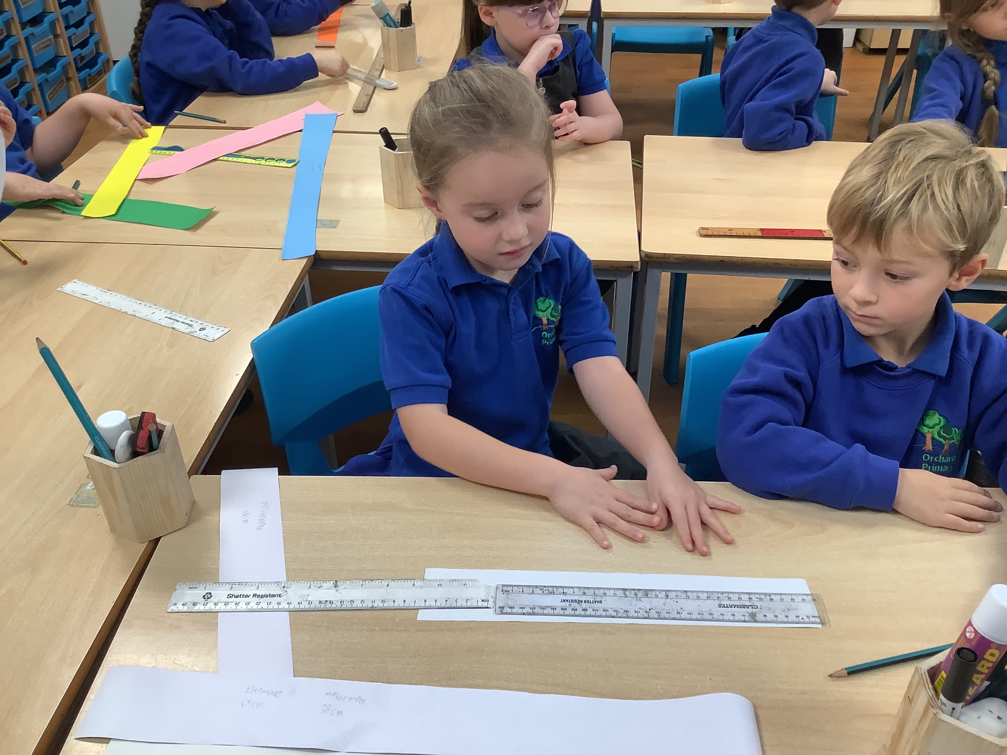 In Maths, we have been exploring length and developing our understanding of the difference between metres and centimetres. Our investigations included measuring various objects both in the classroom and in the playground, as well as comparing the heights of our friends. The children have then used these skills to solve a range of word problems involving measurement and units.