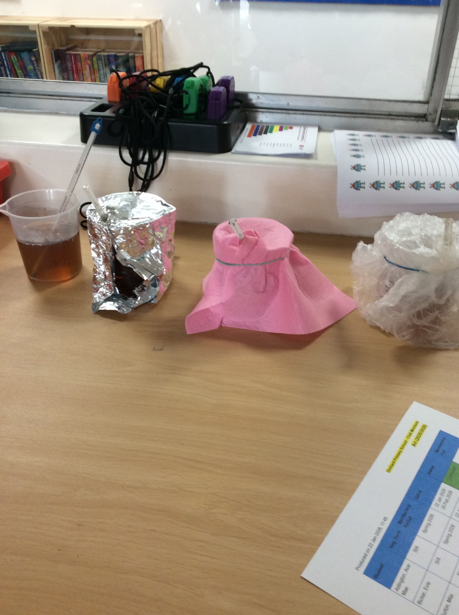 This week we have been investigating thermal insulators. We tested which material would keep our cup of tea warm the longest.