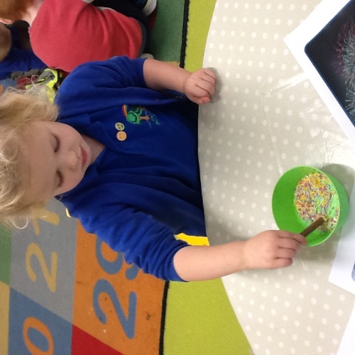 This week we have had a busy week learning all about bonfire night and fireworks. For our baking activity this week we made chocolate sparklers, we melted the chocolate then dipped them into sprinkles to create the sparkler texture. At Woodland explorers we made drew firework patterns onto leaves then cut them up, we also made stick sparklers we collected leaves then tied them to sticks we also collected. We have also created firework paintings- using firework shapes to mark make. We also explored a glitter firework mark making tray, using paintbrushes to mark make patterns. Outside we have been practising our balancing on the stepping stones, making big structures using lego and cutting the leaves we found on the ground. Inside we got out the big parachute, singing songs then playing games.