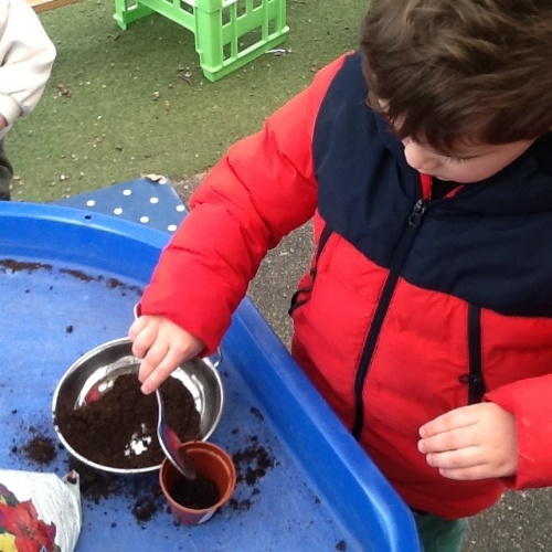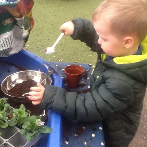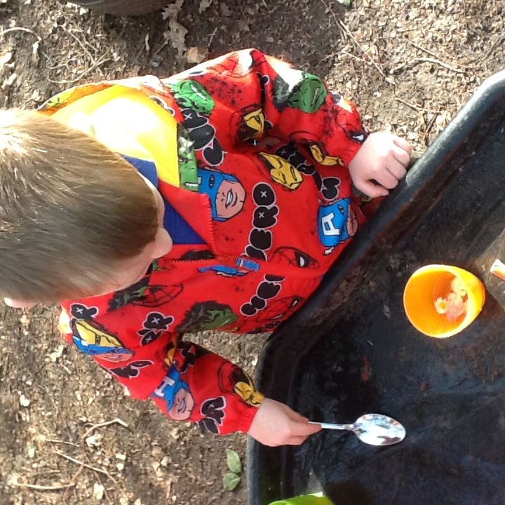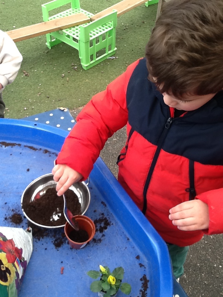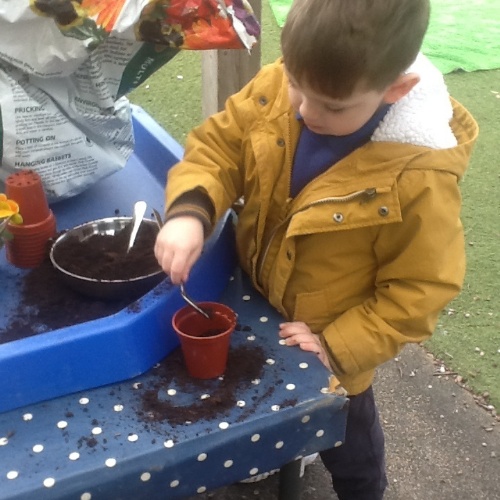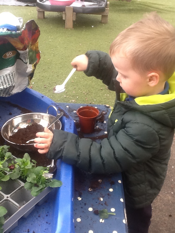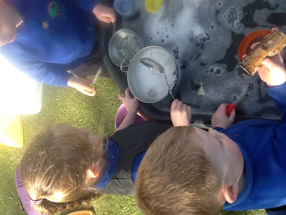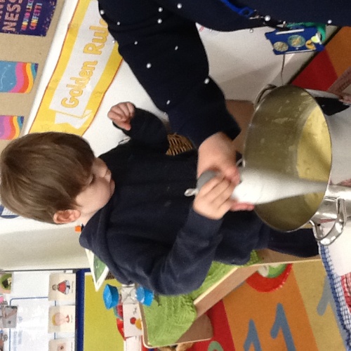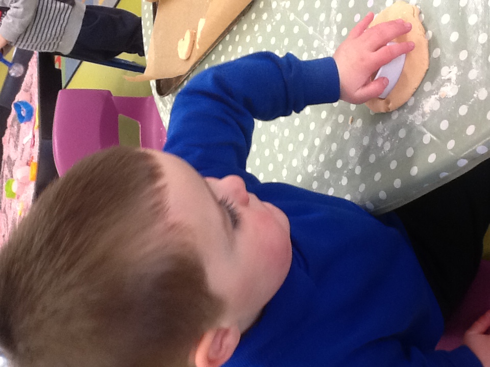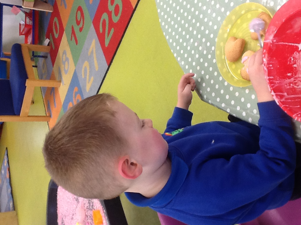We have been busy this week learning all about Valentine’s day and talking about people and things we love. For our cooking activity we made heart biscuits, we then made pink icing to decorate them. We also made heart stamp pictures and talked about who we loved. At Woodland explorers we made a wormery, we filled a bottle with layers of compost, sand and leaves, we then added the worms that we found, covered it in black paper and covered them top. In two weeks we will take off the paper and see how the worms have mixed up the soil. Outside we have been wearing our overalls and collecting water in the trays, making potions and creations for our peers.