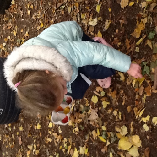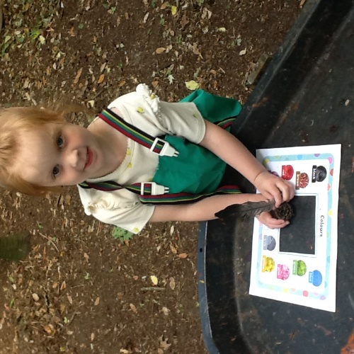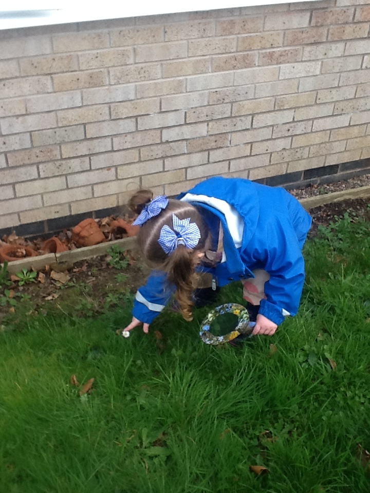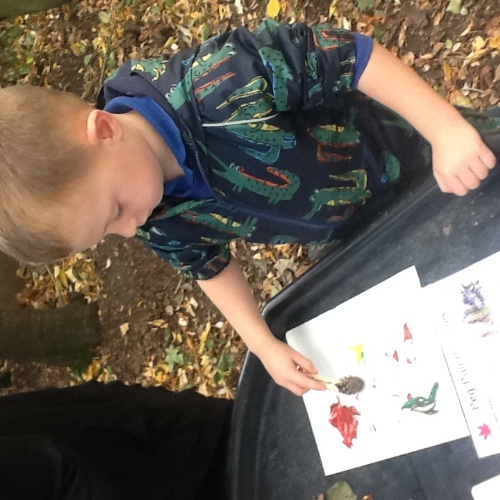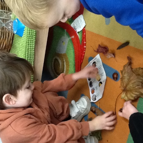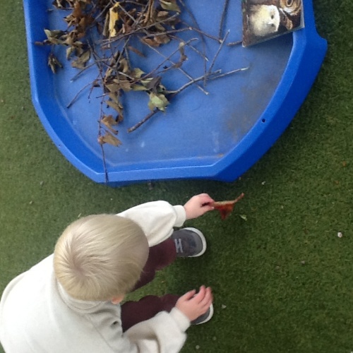 Back in the Pre school room, the children used magnifying glasses to look at the tuff tray full of autumnal items found whilst they were out exploring, conkers, pinecones and leaves amongst other things.