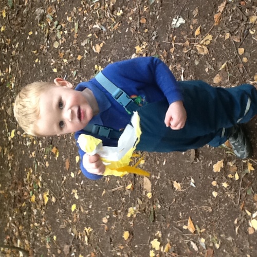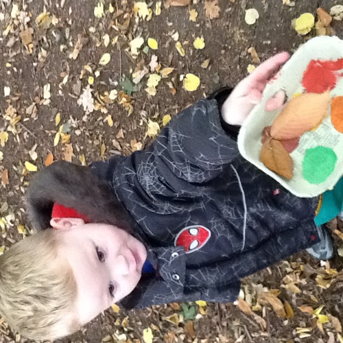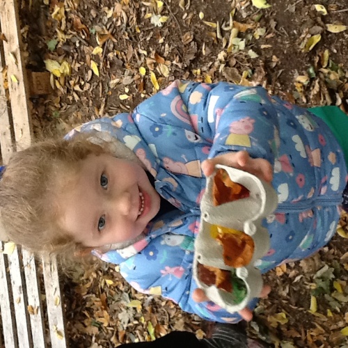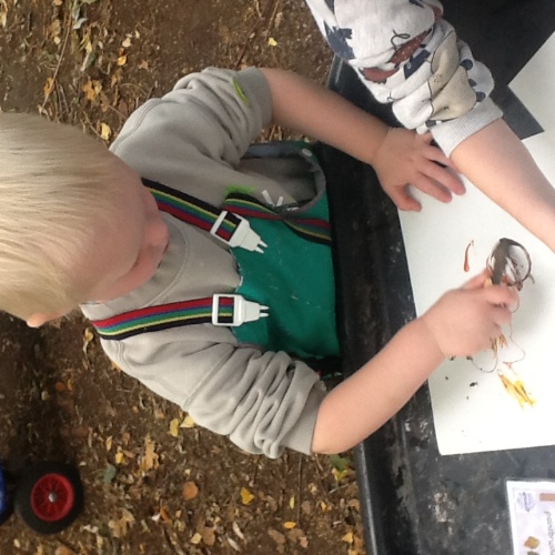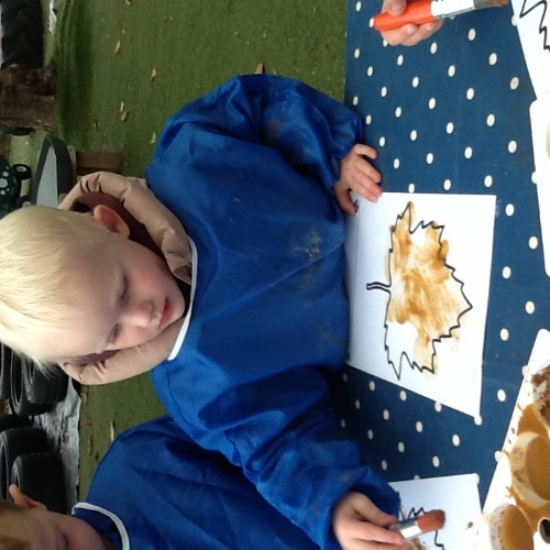 This week we have been doing lots of Autumn-themed activities. At Woodland explorers this week we made nature paintbrushes, we looked around the forest for Autumn nature, then attached them to the end of a wooden peg and used them to mark make with paints. We then made 'conker comets' using a conker and tissue paper, we tried them out on the big field to see how far they would fly. For our cooking activity this week we made Autumn leaf and animal biscuits. We mixed the ingredients then all had a go at rolling out the dough and using the cutters. For our Storytime session this week we read the story 'Owl babies' we made a giant nest for the owl babies using sticks and leaves we found in the garden, we then all had a go at pretending to be owl babies and sitting in the nest! Also outside we did some spice painting, we smelled all the spices then mixed them with water to make a paint and painted leaves and pumpkins. We have also been very busy collecting things for our Autumn hunt bags, then showing our friends at mat time and talking about what we have found.