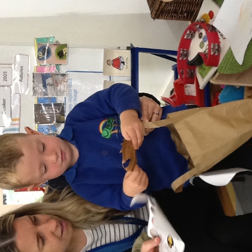 The theme of autumn was explored in the woodland area with the children making their own leaf person puppet.