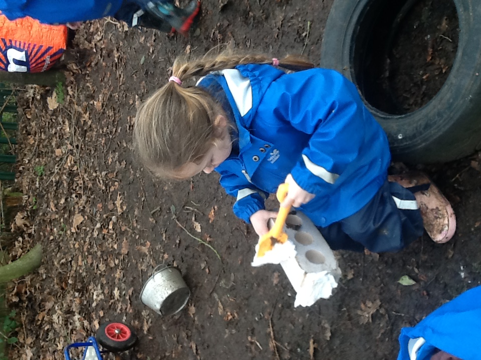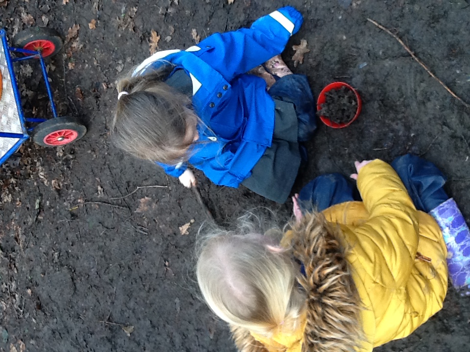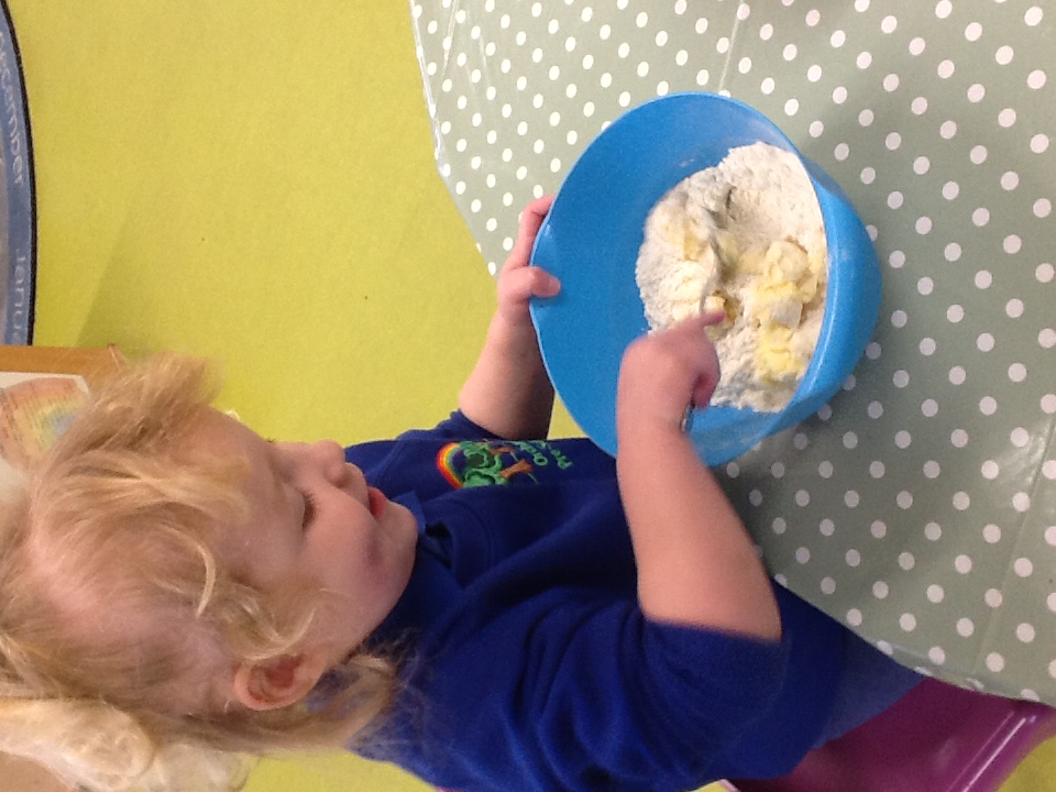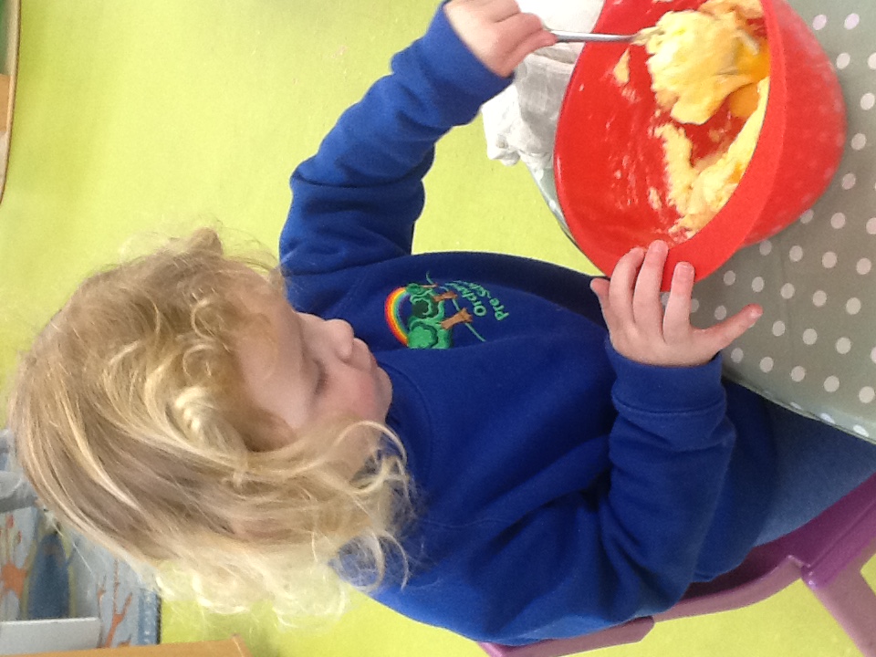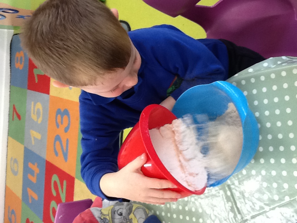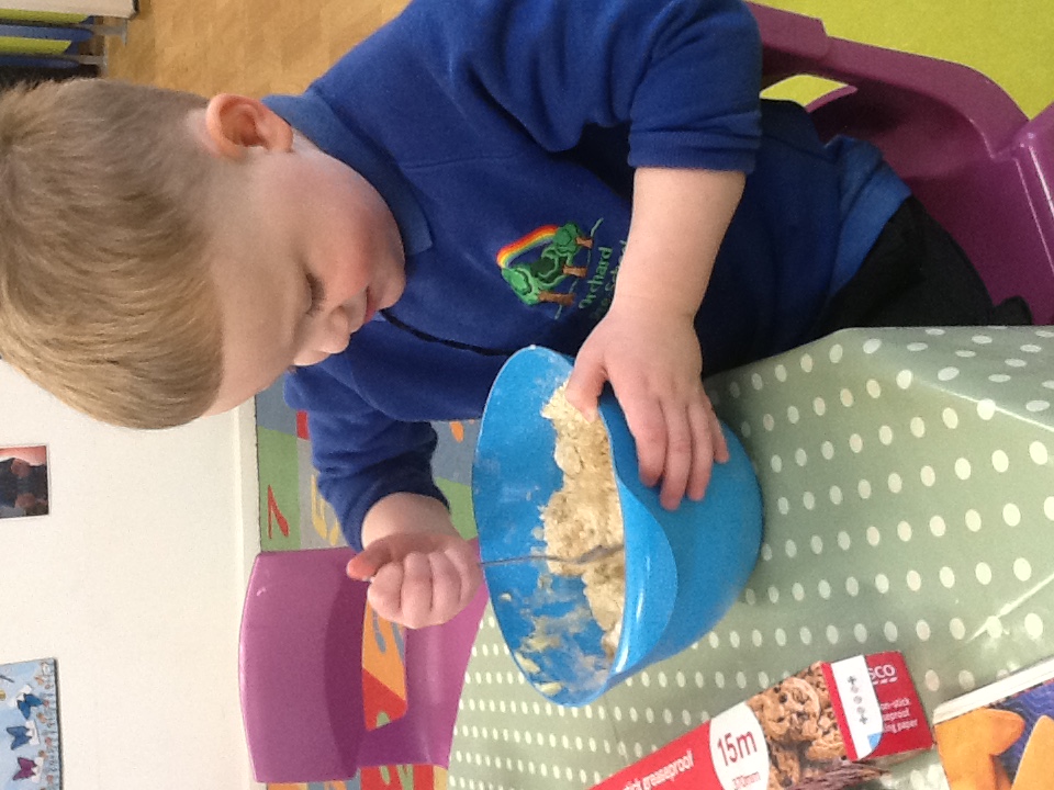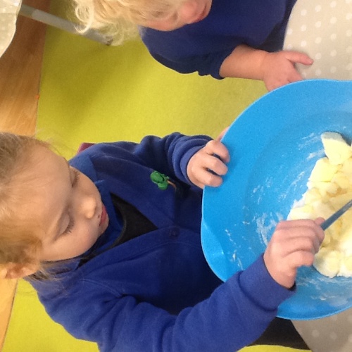 This week we have started a new topic book 'The Gingerbread man', we have explored a new story tray using the masks and puppets. Outside we have been practising our balancing on the stepping stones and walking on the planks. For our cooking activity we made rock cakes, we mixed all the ingredients together then moulded them into rock shapes. At Woodland explorers we opened the wormery and saw how the worms had mixed up all the soil, we then returned them to the ground. We then made our own love potions, we made the water pink then collected flowers, grass and leaves and created love potions. We talked about who they love from their families and why.