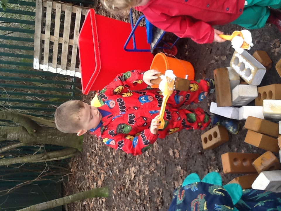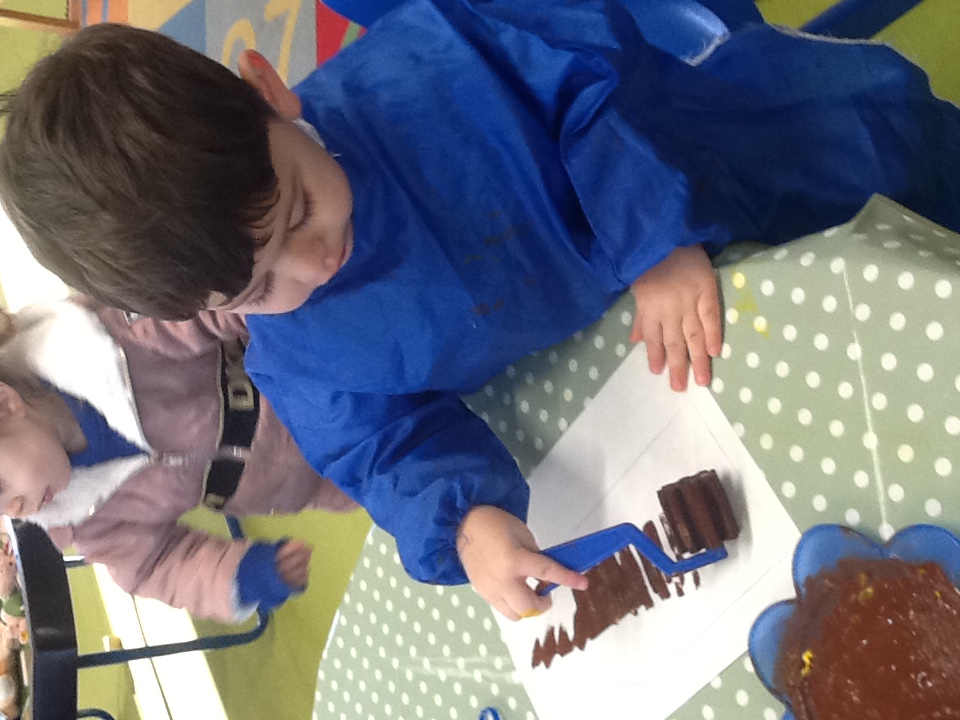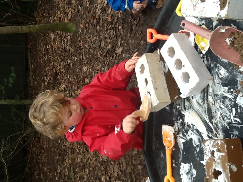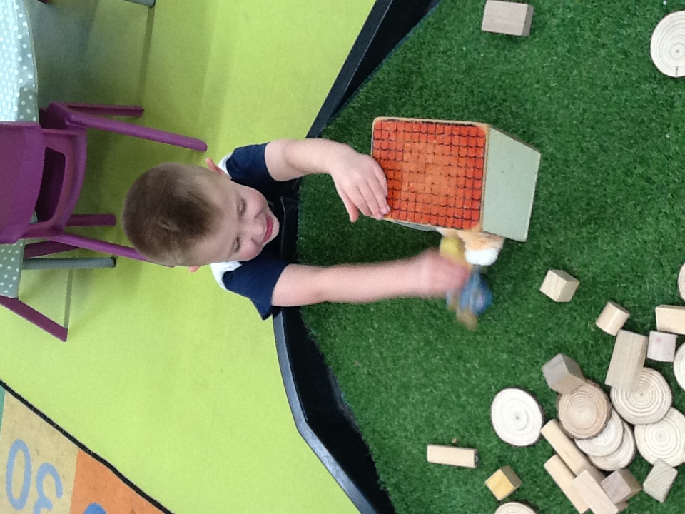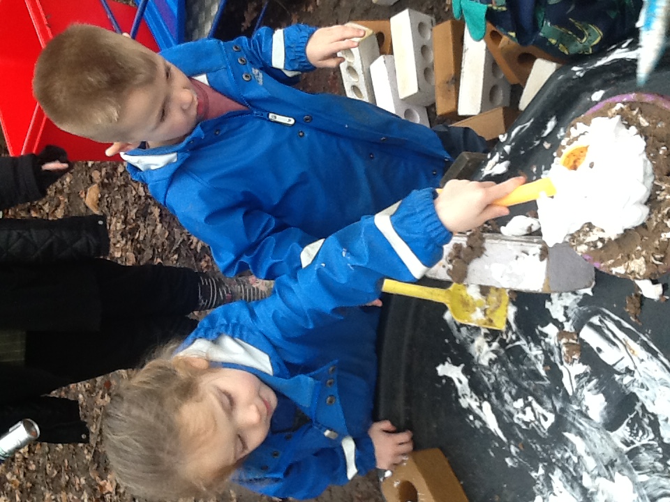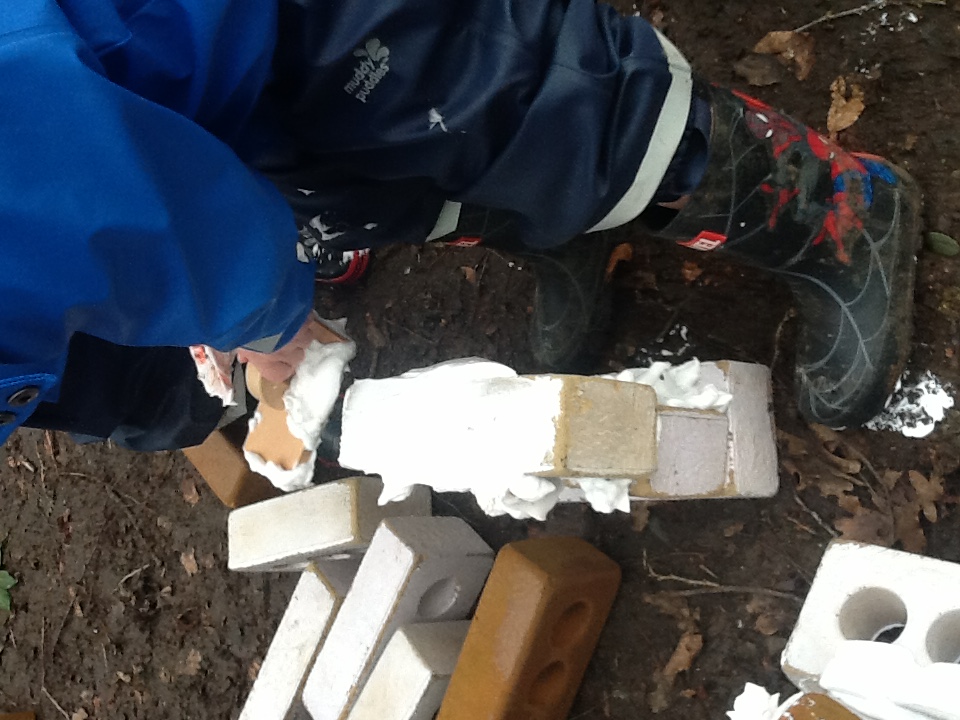 This week we have started a new story, ‘The Three little pigs’. For our cooking activity’s we made cheese straws, we sprinkled the cheese onto the pastry then twisted them round. T Woodland explorers we took the foam bricks up to the forest and made our own ‘cement’ using shaving foam, sand and water. We used tools to stick them together just like the third little pig. We have been retelling the story using the puppets and sticks, straw and bricks. We also painted straw, stick and brick houses using different materials and rollers. Inside we made lots of creations using the magnets, and outside the bricks.