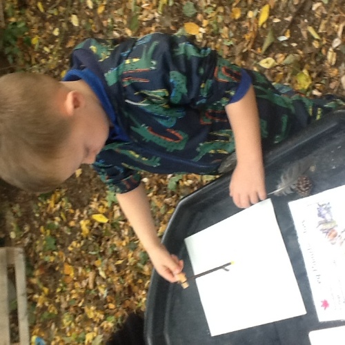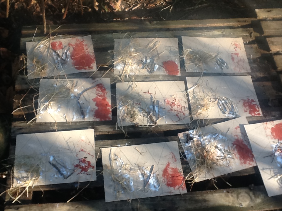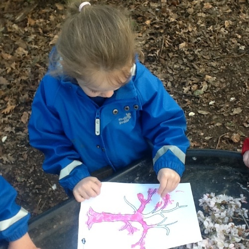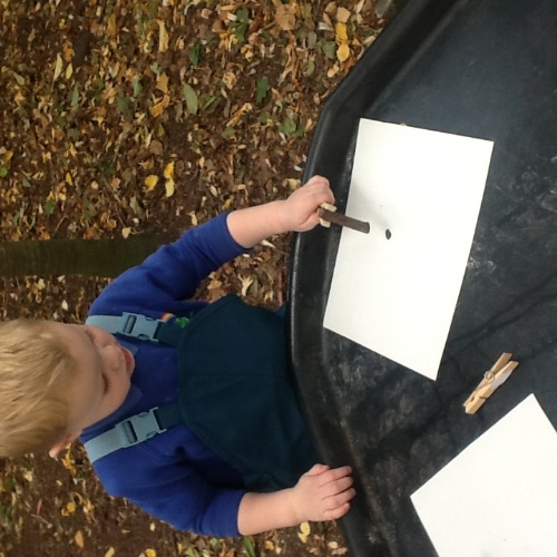 The children displayed their fine motor and mark making skills at this week's Woodland Explorers. Finding natural items in the woods to use as a mark making tools. Pegs to hold leaves, twigs, helicopter seeds amongst some of the items found and used to mix paint colours and create wonderful pictures.