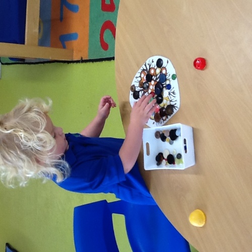 This week we have been exploring all things 'Autumn', we explored a conker-themed tray, counting the conkers, rolling them down the tubes and placing them in the egg boxes. We also practised our fine motor skills by placing buttons and lids onto Autumn pictures. Outside we did some conker smashing! We used hammers to crack open the conkers and found them inside. For this week's cooking activity we made pancake faces, we used fruit to create eyes, nose, mouth, ears and hair. The children used the mirrors to see their reflections. At Woodland explorers we made blackberry gloop! We added cornflour, water and blackberries to a tuft tray, mixed it all together to explore the colours and textures. Using the mashers to squash the blackberries and mix them all together. During our storytime focus we read our topic book 'The colour monster', we read the story using the colour monster toys, then used the puppets to match the colours to the feelings and asked the children what made them happy, sad e.tc. we also explored colour mixing using a poly pocket to mix the colours with our fingers.
