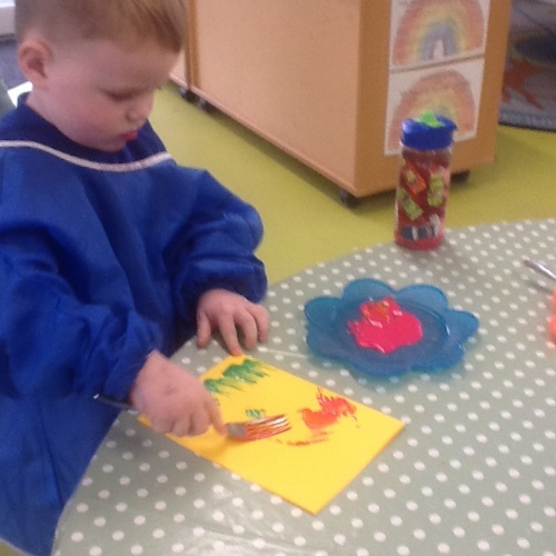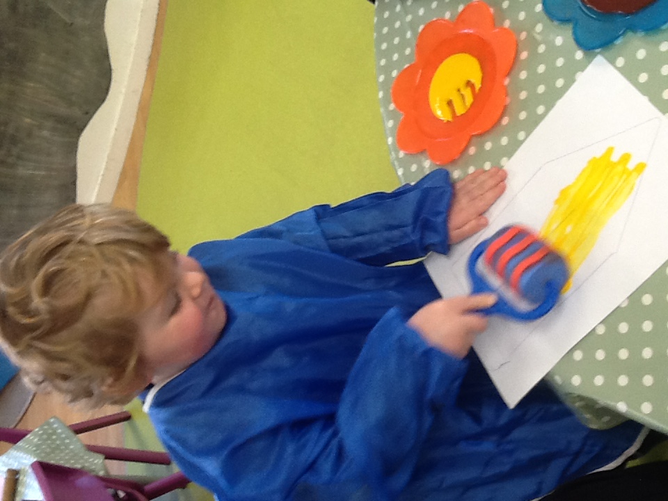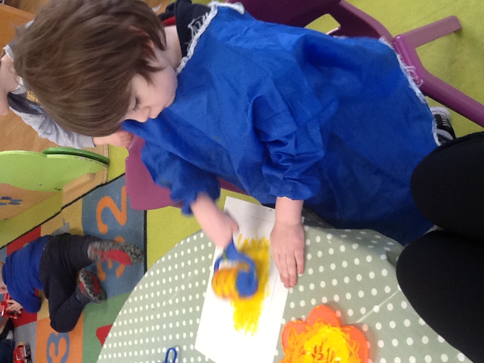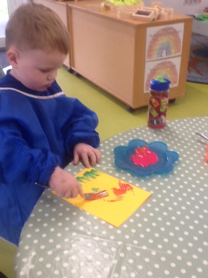 Enjoying the start of spring with creative art and craft activities, colourful tulips created by use of forks and paints, wax and pencil crayon to complete colouring sheets. A team of children, working together to build a castle wall with the giant lego bricks amongst some of the activities the children have enjoyed.
