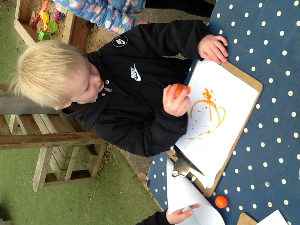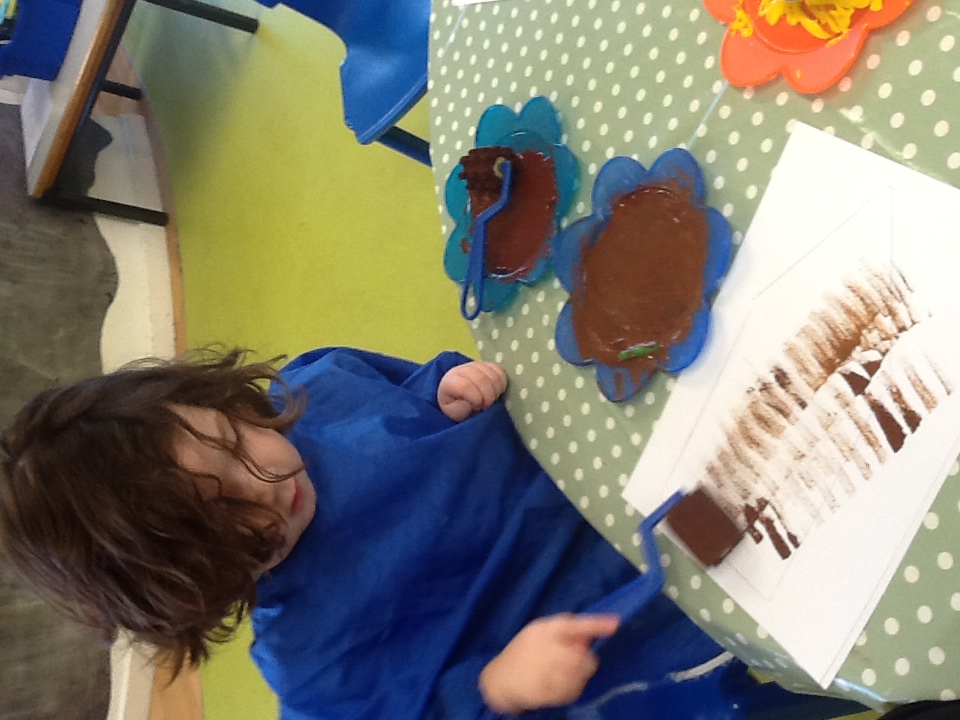 Conker painting. The children took turns to roll a conker around a tray of paint to create a pattern on the paper. They were also able to see the colours change as the conker mixed the paints.
