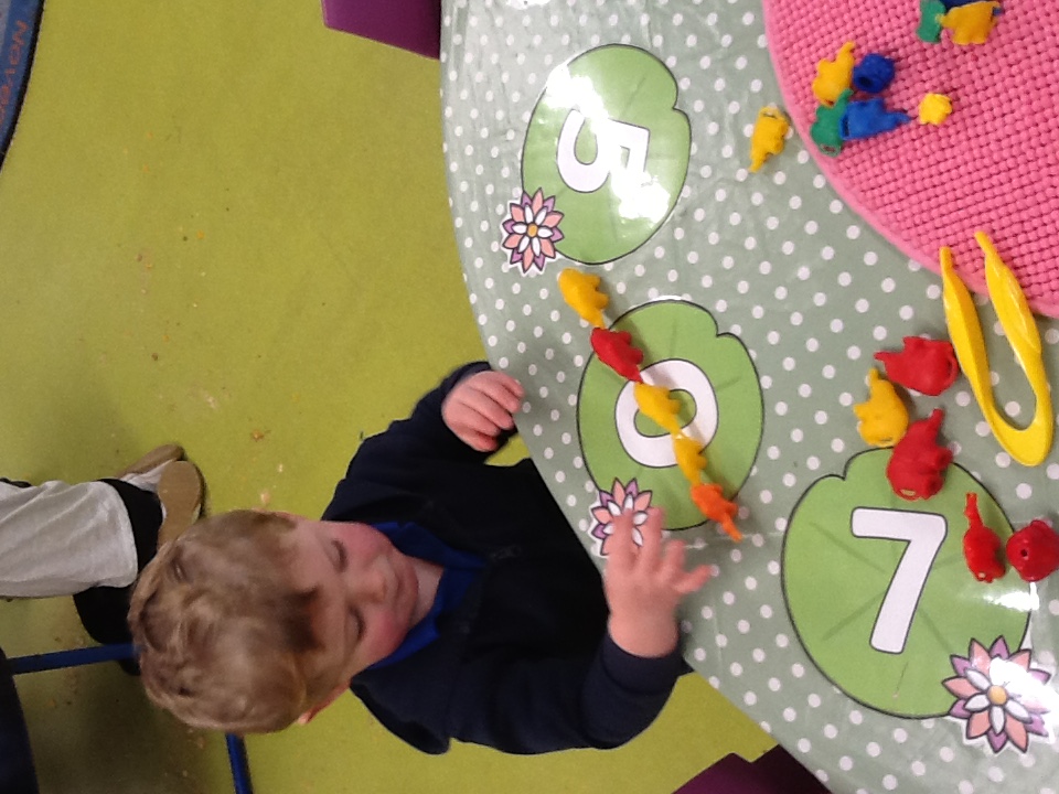 Developing their number recognition skills by identifying the number written on a leaf and then pegging the correct amount of pegs to a leaf.