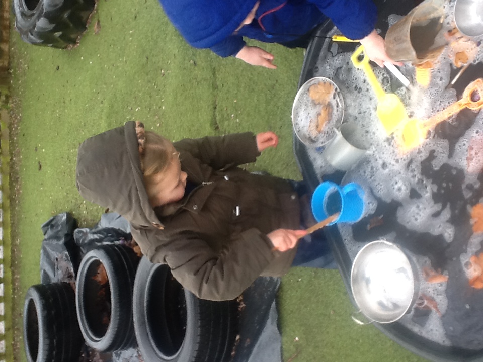 An exciting visit to the Woodland area, creating potions. Mixing ingredients together in a pumpkin and watching the contents grow, fizzle and pop out of the pumpkin to create a messy play activity on the tuff tray.