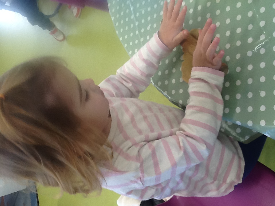 So much concentration and enjoyment, making the bear biscuits.