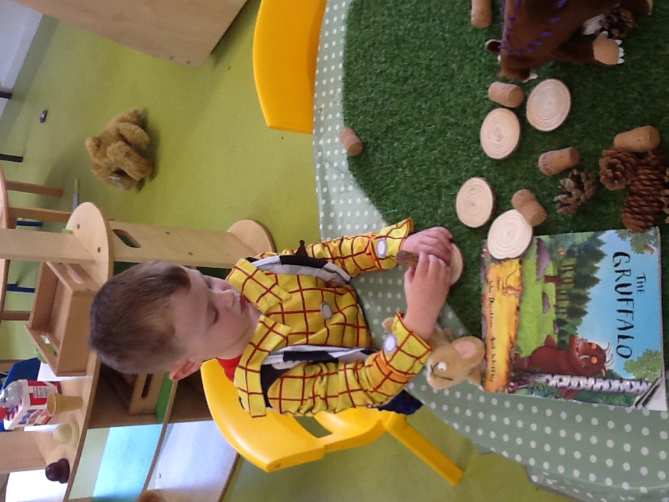 We introduced our new topic book, 'The Gruffalo'. The book is already proving very popular with the children, along with the fun activities that were linked to the story. The children explored the Gruffalo sensory tuff tray and soft toy characters from the book, painting a Gruffalo using forks and brown paint. A delicious ‘Gruffalo crumble’ was made in this week’s cooking session. After carefully preparing the ingredients and cooking the crumble, the children got to sit down and sample some too.