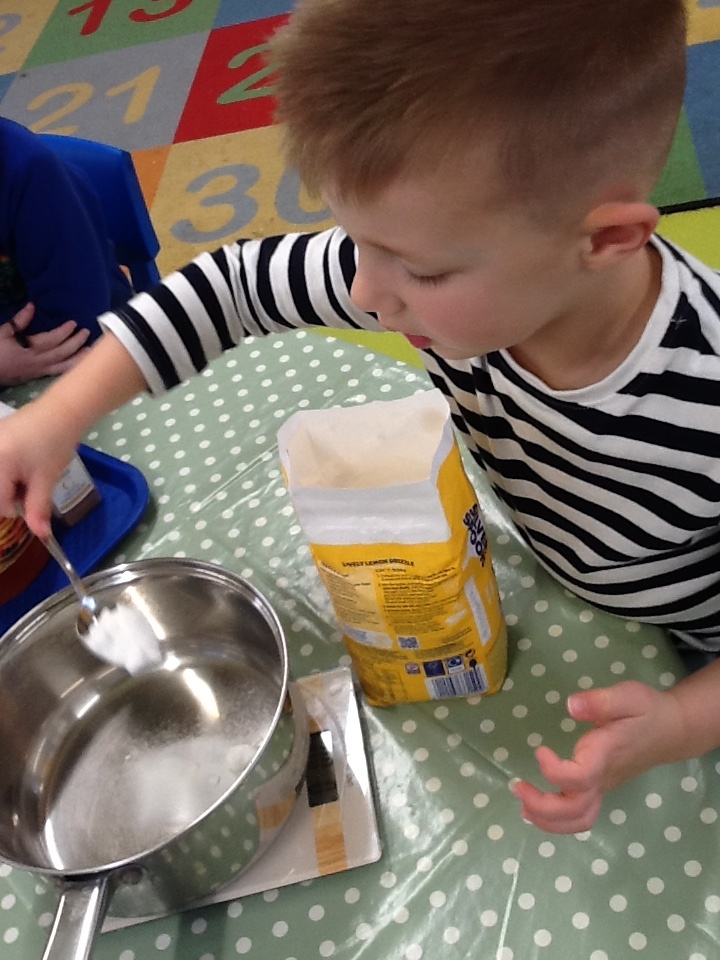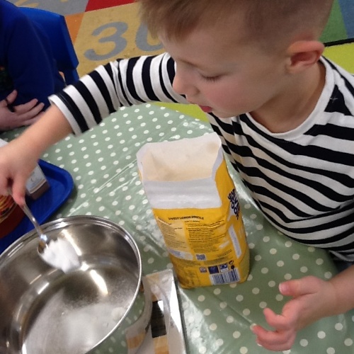 Monday's cooking session saw the children measure ingredients, stir the mixtures and roll the dough to create yummy gingerbread biscuits. They smelt so good as they cooked.