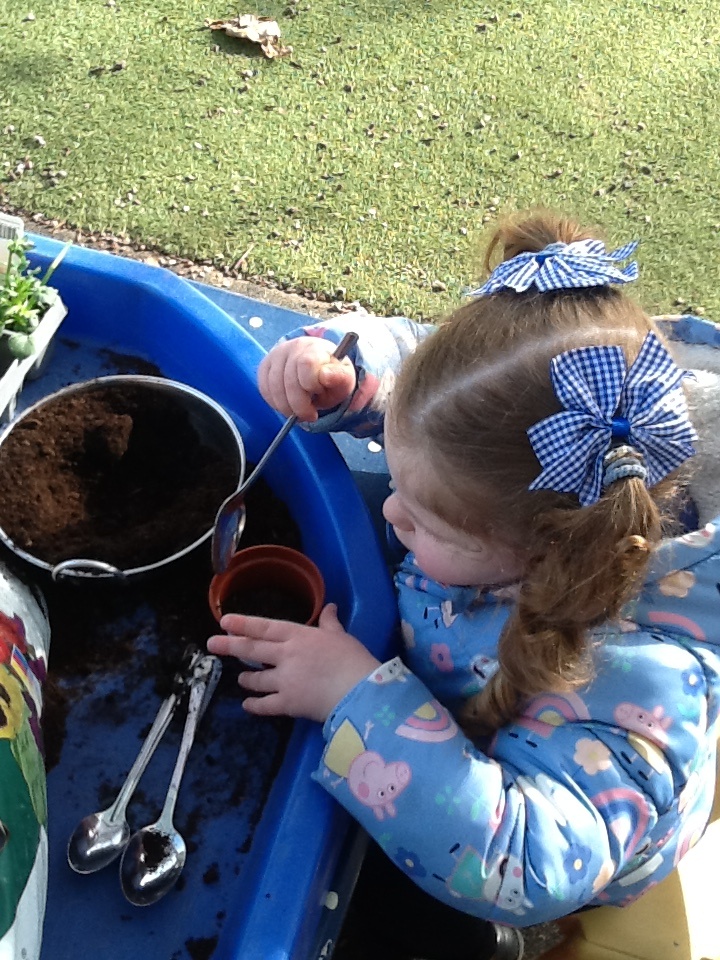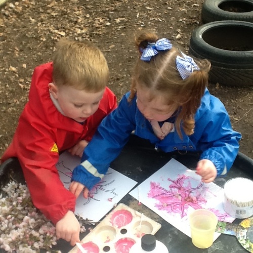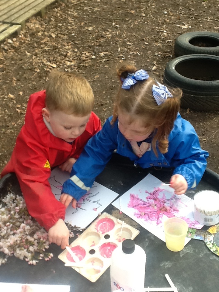 This week we have learning all about the start of Spring. At Woodland explorers we went on a Spring hunt using spring spotter magnifying glasses, we found blossoms, daffodils and wild flowers. We then used the blossom from the tree to create blossom tree collages, using pink paint to make marks. For our cooking activity, we made ginger cake, we mixed all the ingredients then melted them and put it in the oven. We have also been very busy making Mother's Day cards, we have also planted pansies for Mother's Day. We have been exploring outside, washing babies, making car ramps and building lots of sand castles.