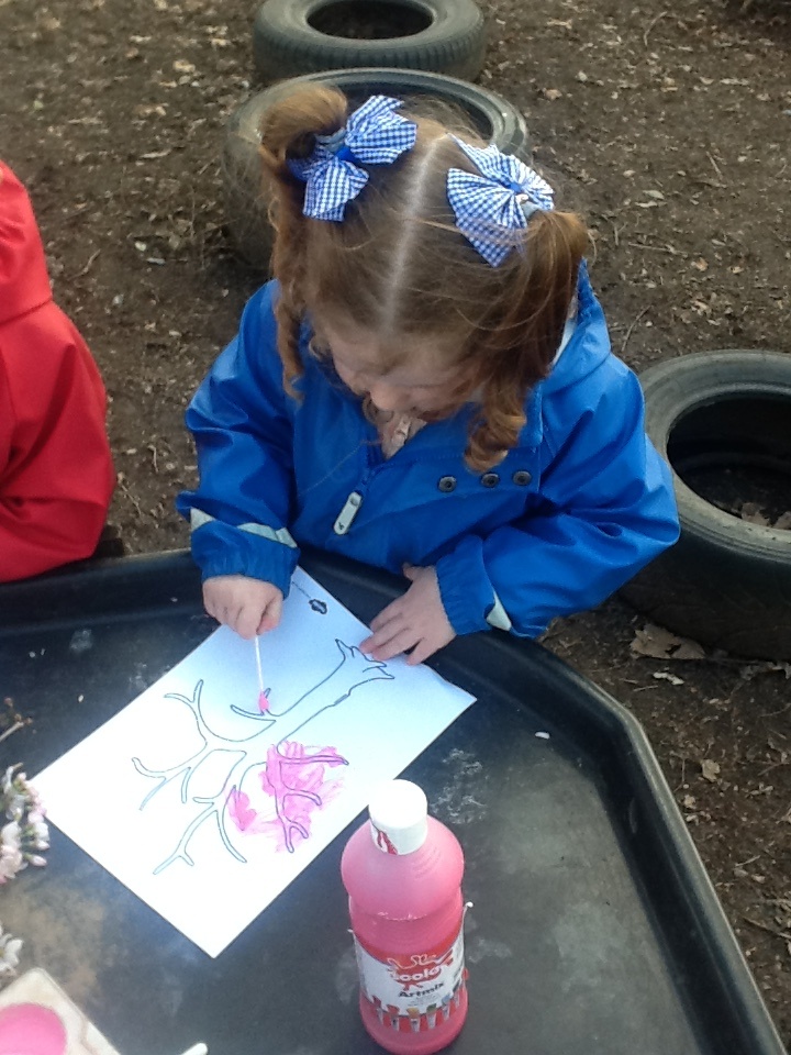 Back in the Preschool room, the children created artwork of their findings. Wonderful free paintings of a bunch of daffodils and delicate cotton bud dabbing to create blossom on the trees.