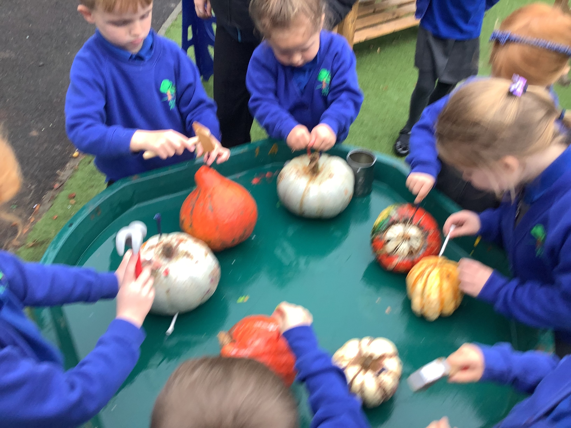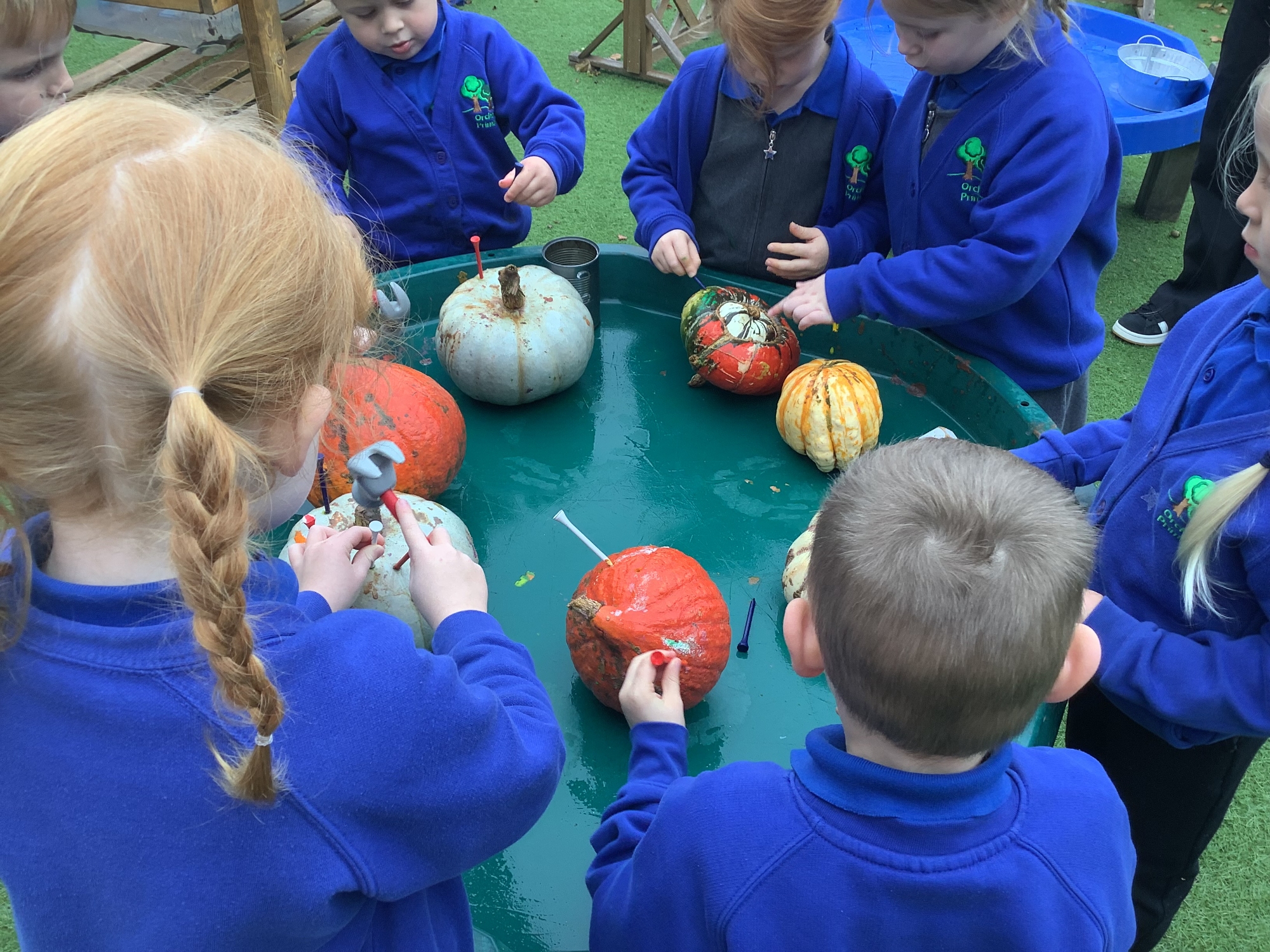 We went on an Autumn leaf walk and we loved comparing the different leaves that we found. We looked at their colour, shape and size. We then used these Autumn leaves to make leaf rubbing and leaf prints. We have also loved exploring pumpkin potions. We mixed vinegar and bicarb into the pumpkins to make the potions fizz!