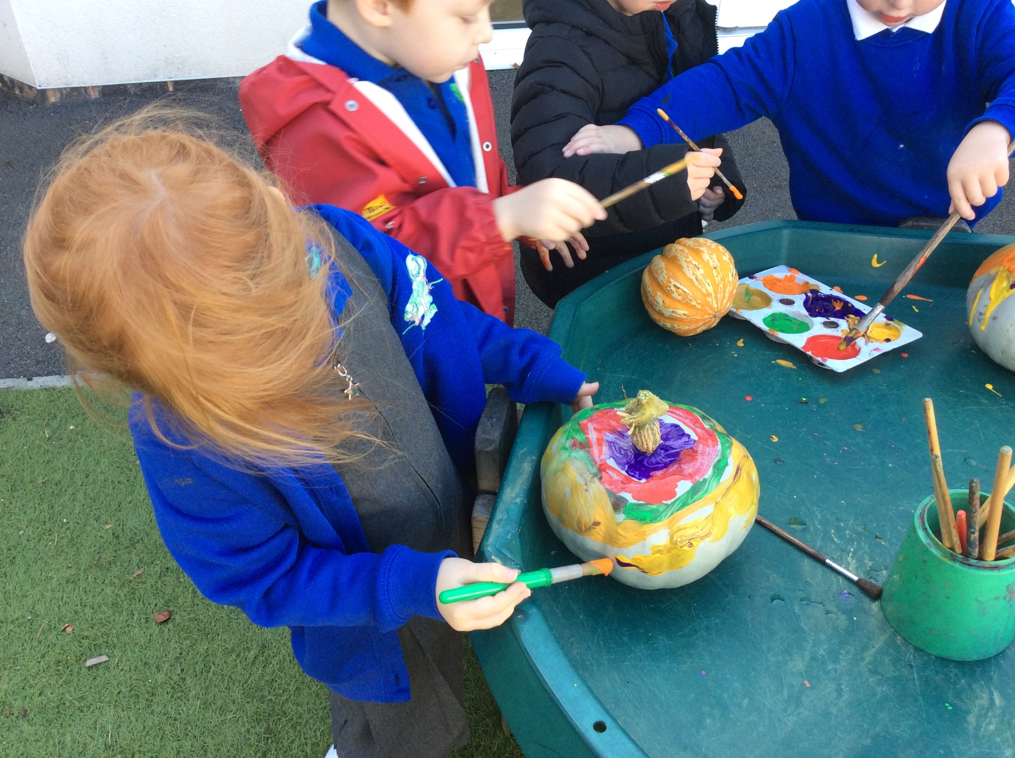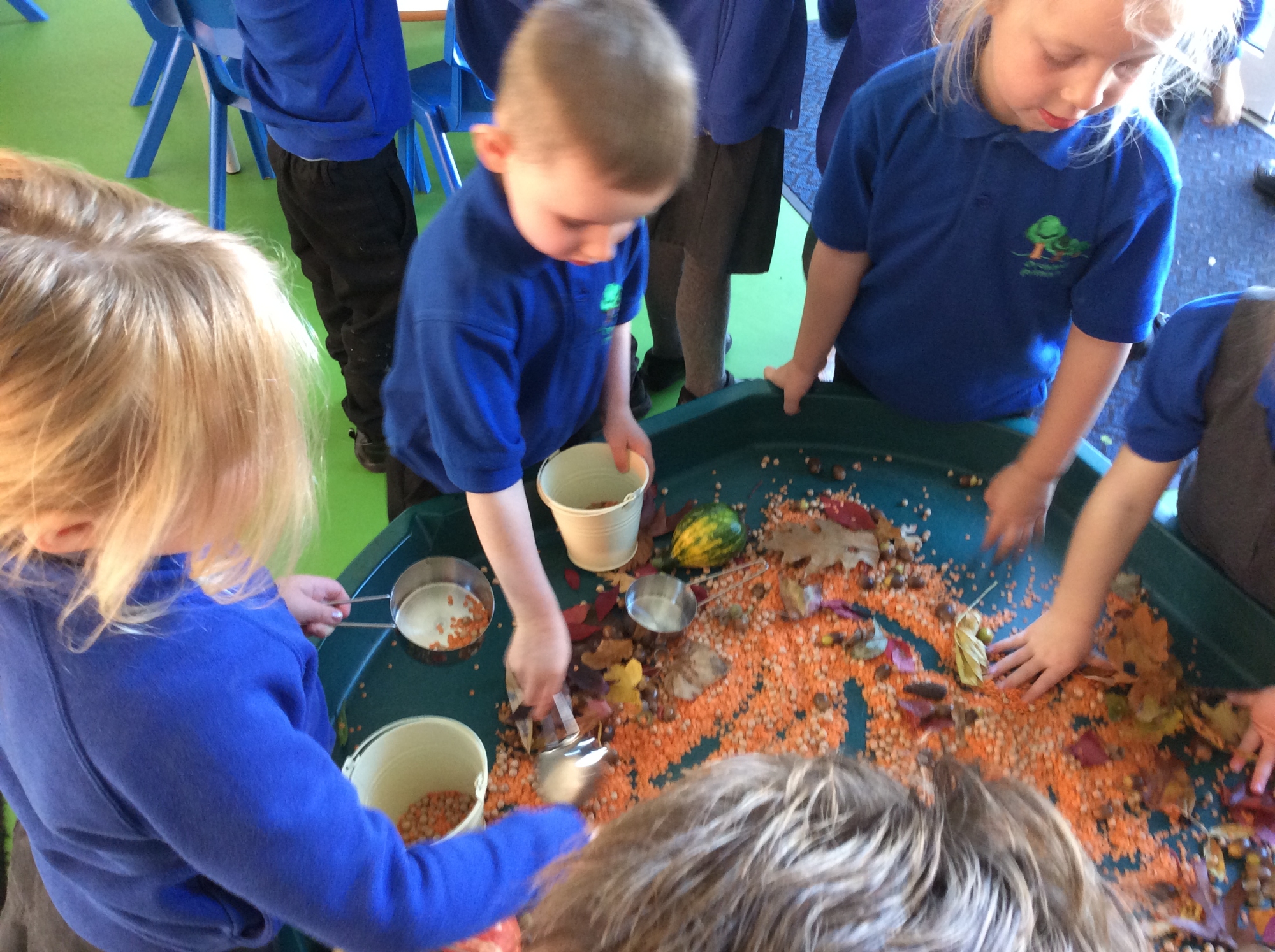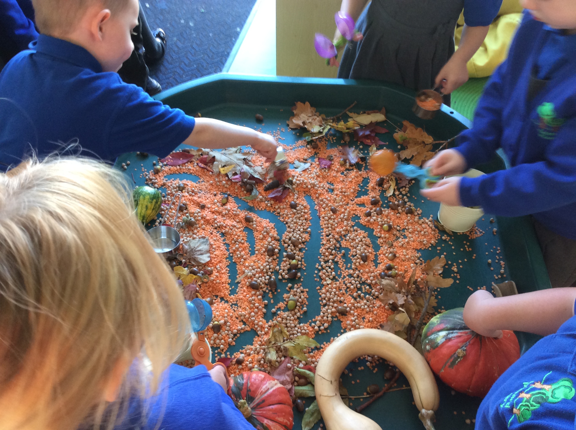 We have been exploring the Autumn tuff tray - pouring and scooping the lentils and chickpeas into the buckets. We have also had lots of fun painting pumpkins with different patterns and colours.
