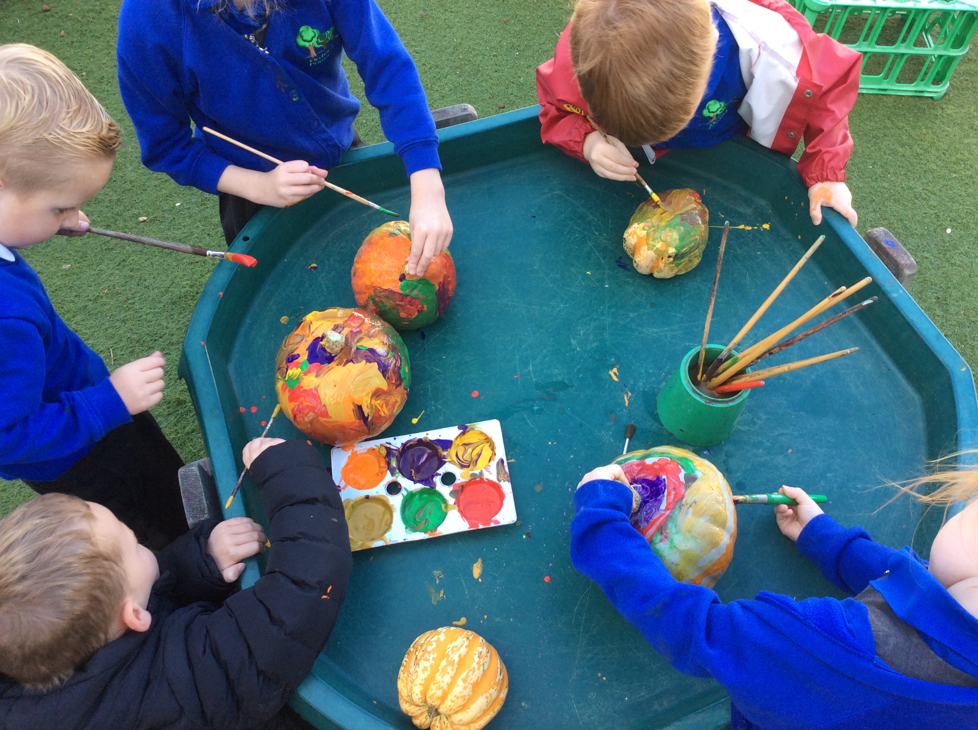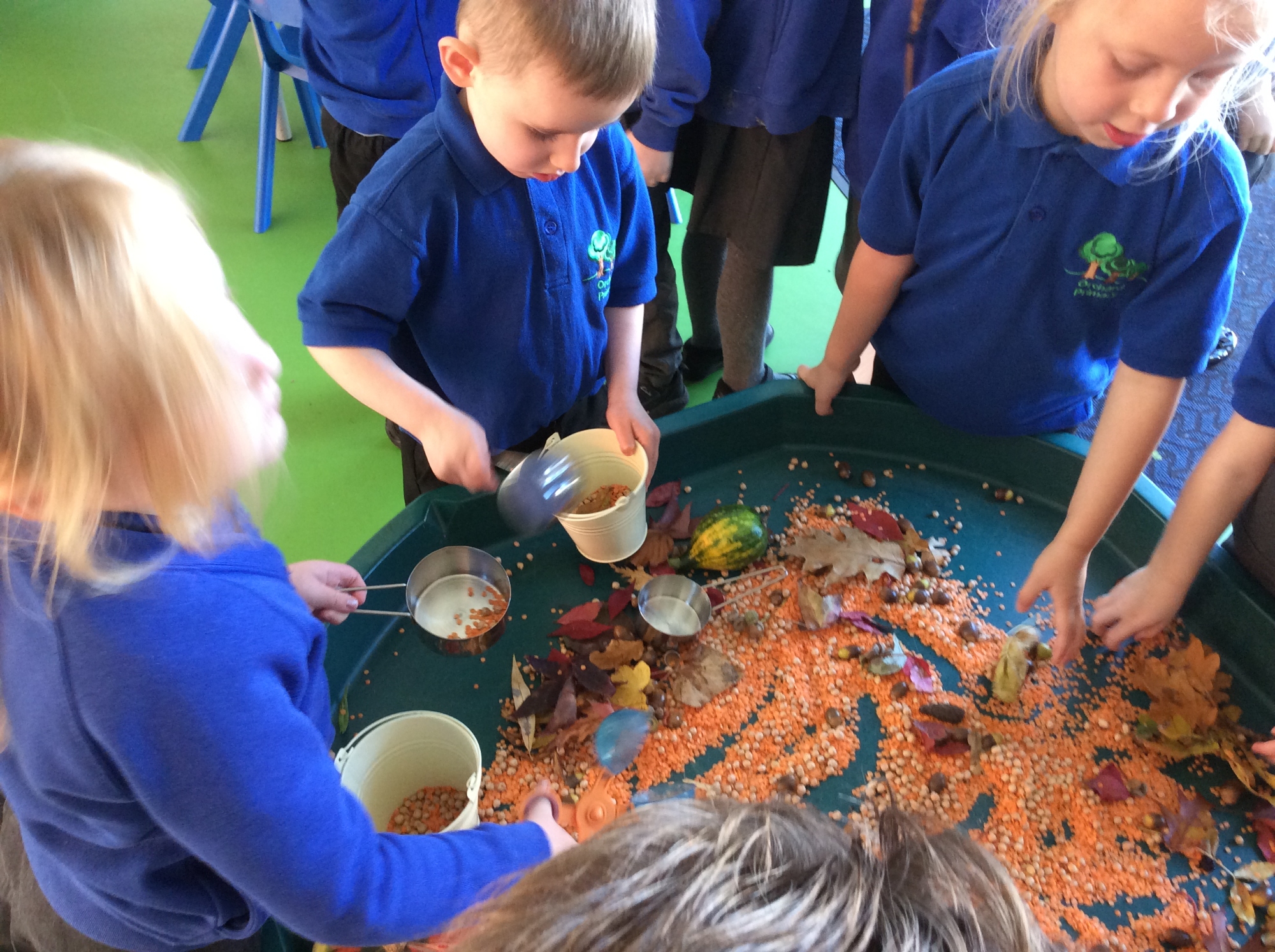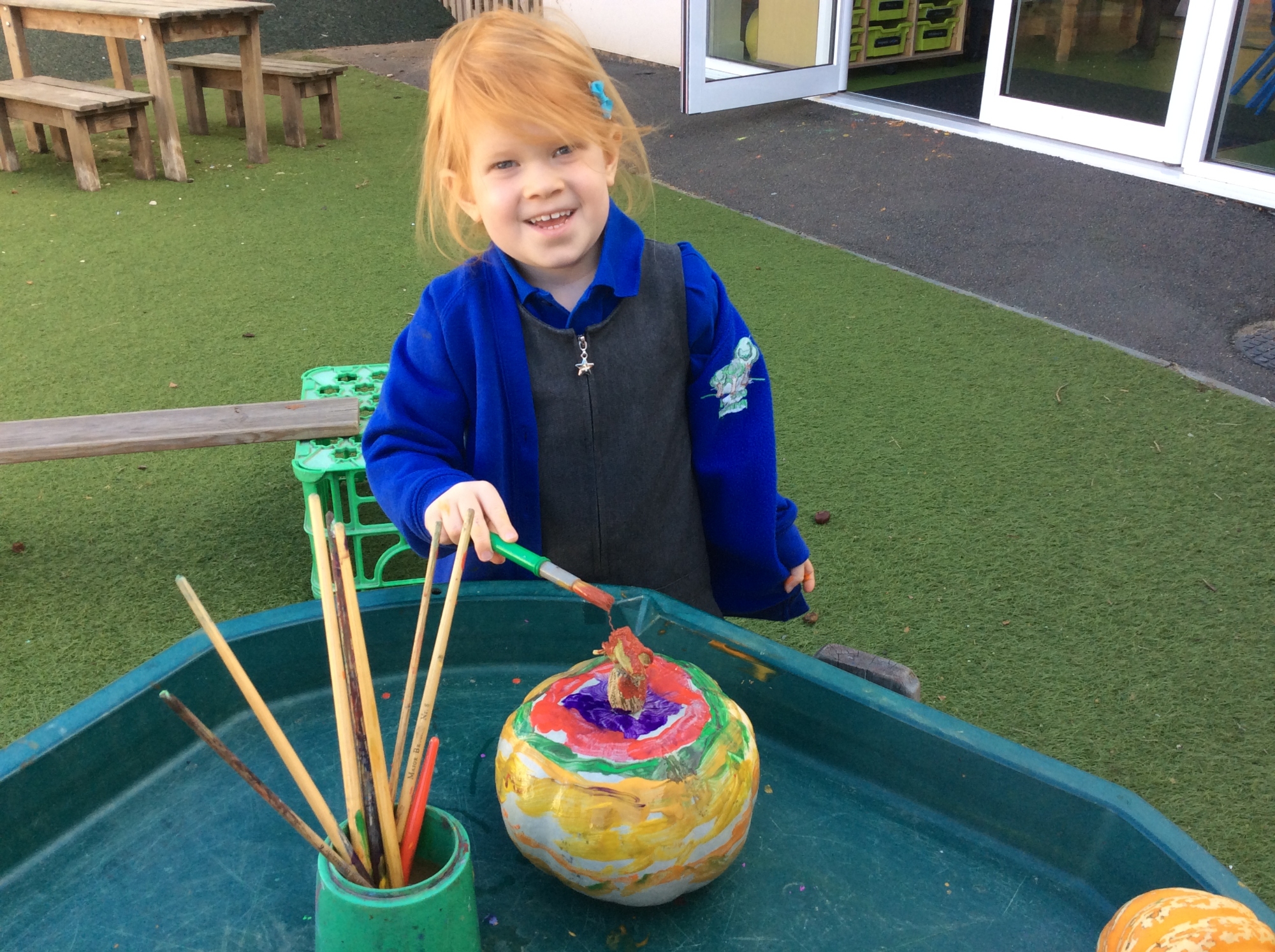 We have been exploring the Autumn tuff tray - pouring and scooping the lentils and chickpeas into the buckets. We have also had lots of fun painting pumpkins with different patterns and colours.