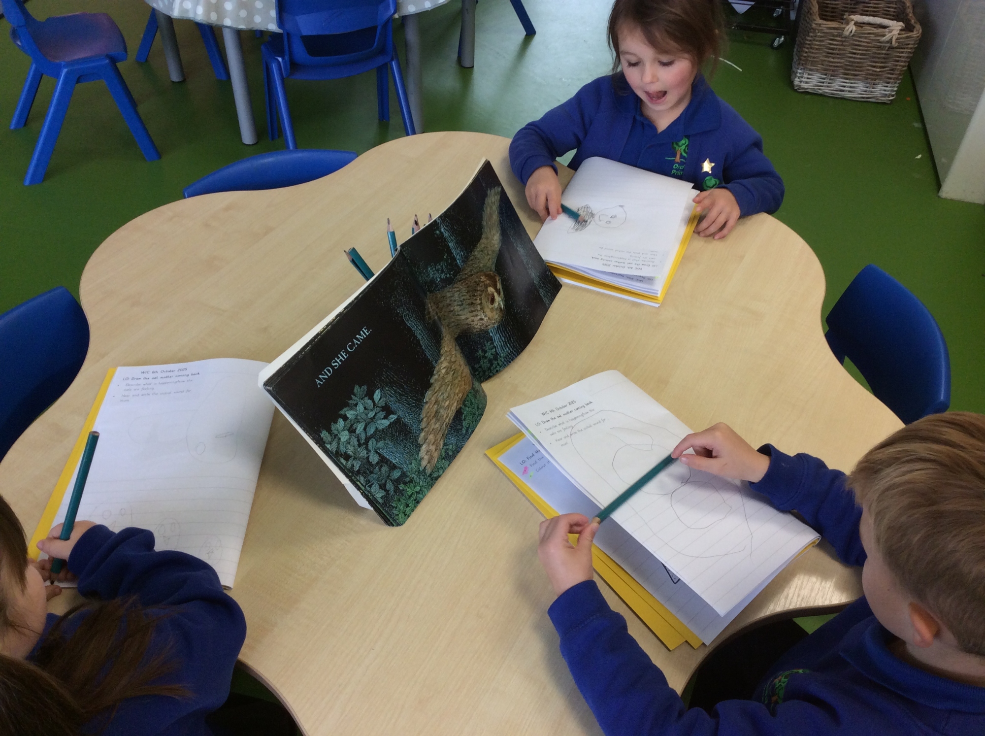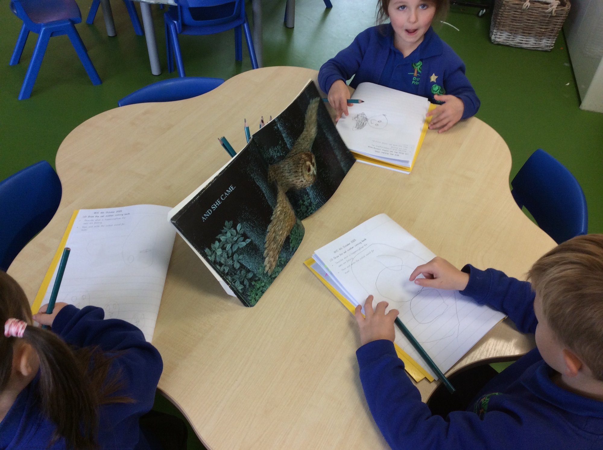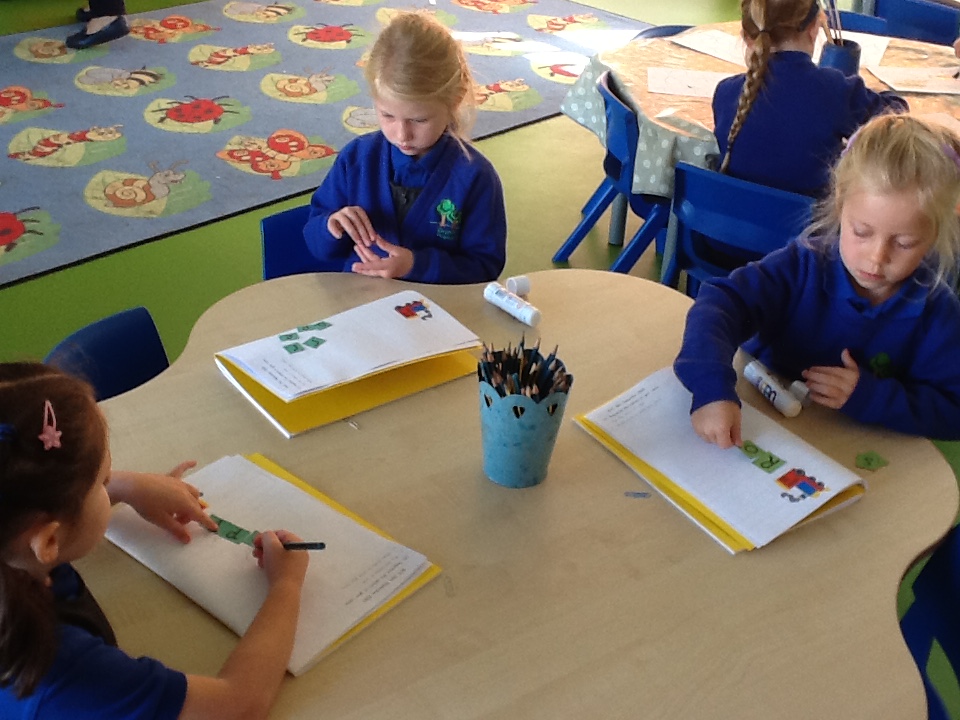 In Literacy, we have been writing simple words to label the pictures from 'Owl Babies', such as 'log', 'mum', 'hop' and 'sit'. We used our Fred Fingers to help us to spell the words.