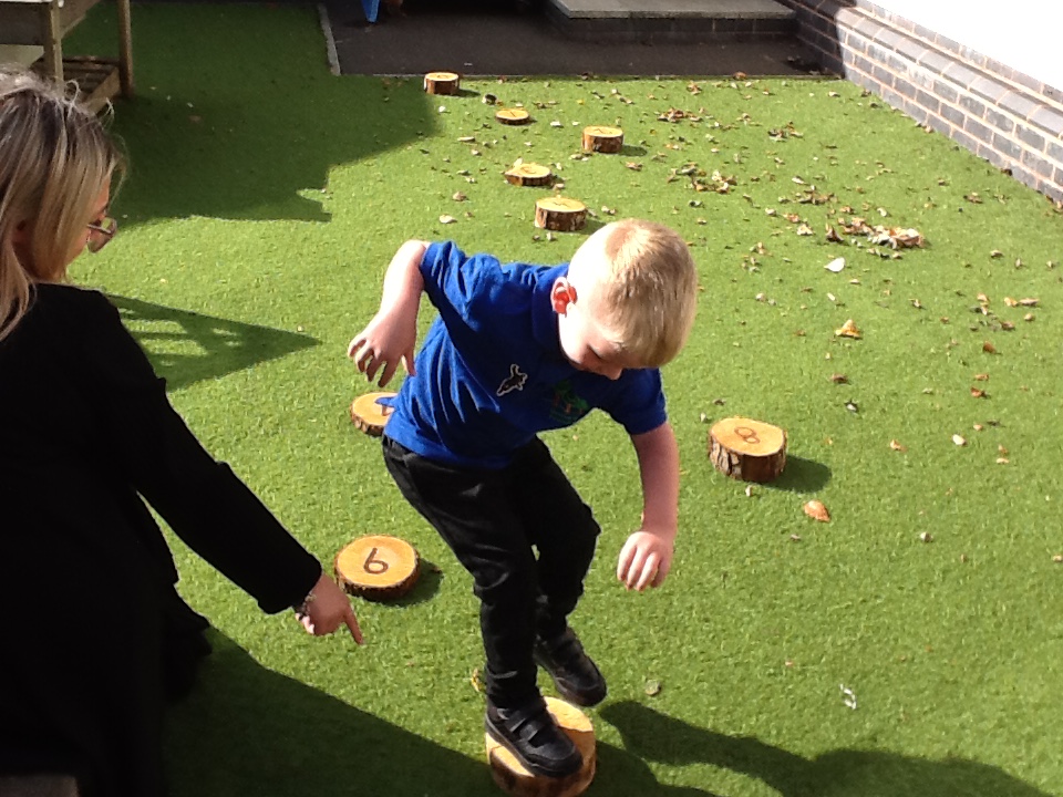 In maths, we have been learning all about repeating patterns. We made repeating patterns using blocks - we also made repeating patterns using potato prints! We have also been practising counting to 10 - we jumped between each number log, counting to 10!
