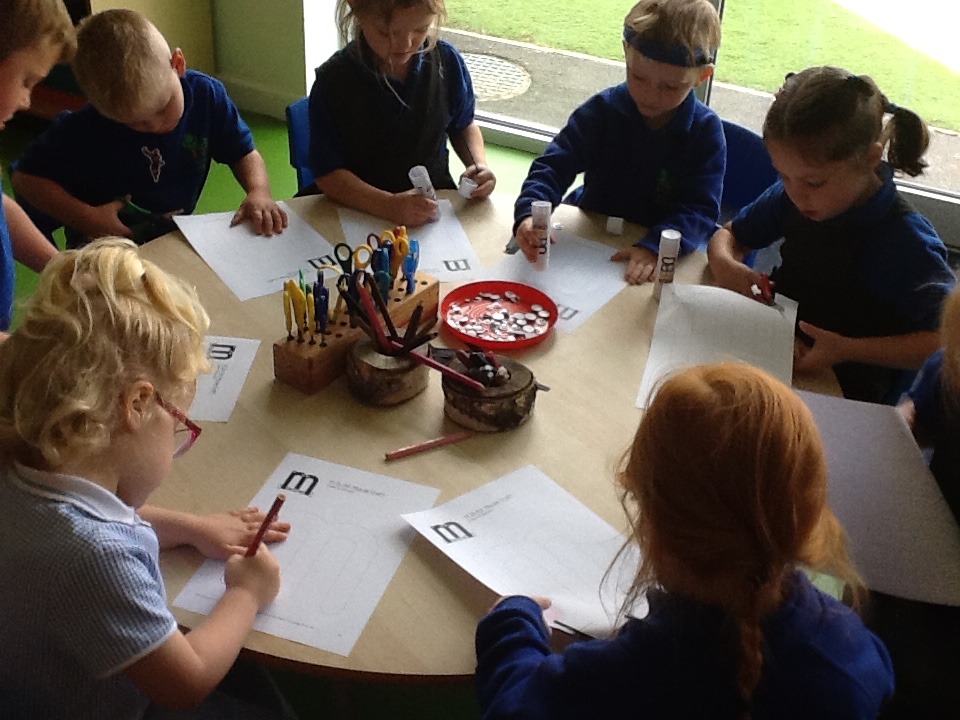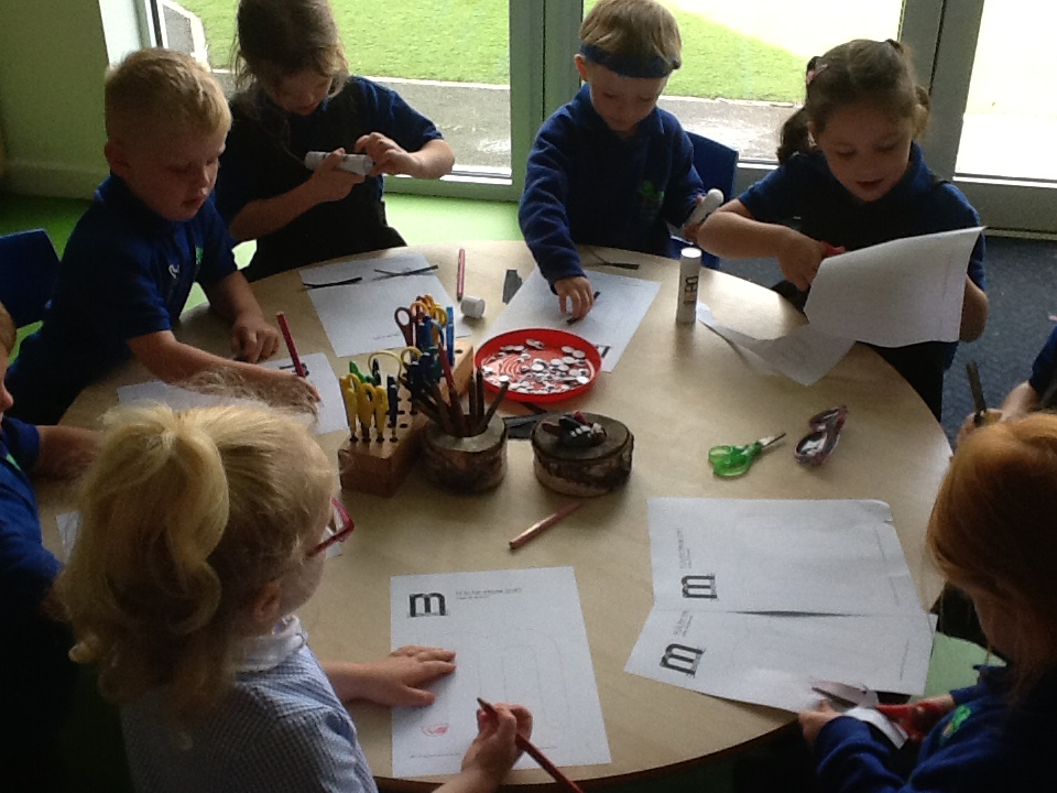 In phonics, we have been learning to recognise and write 'm'. We cut out the letter 'm' and made it into a m-m-mouse by sticking on whiskers, ears and googly eyes.