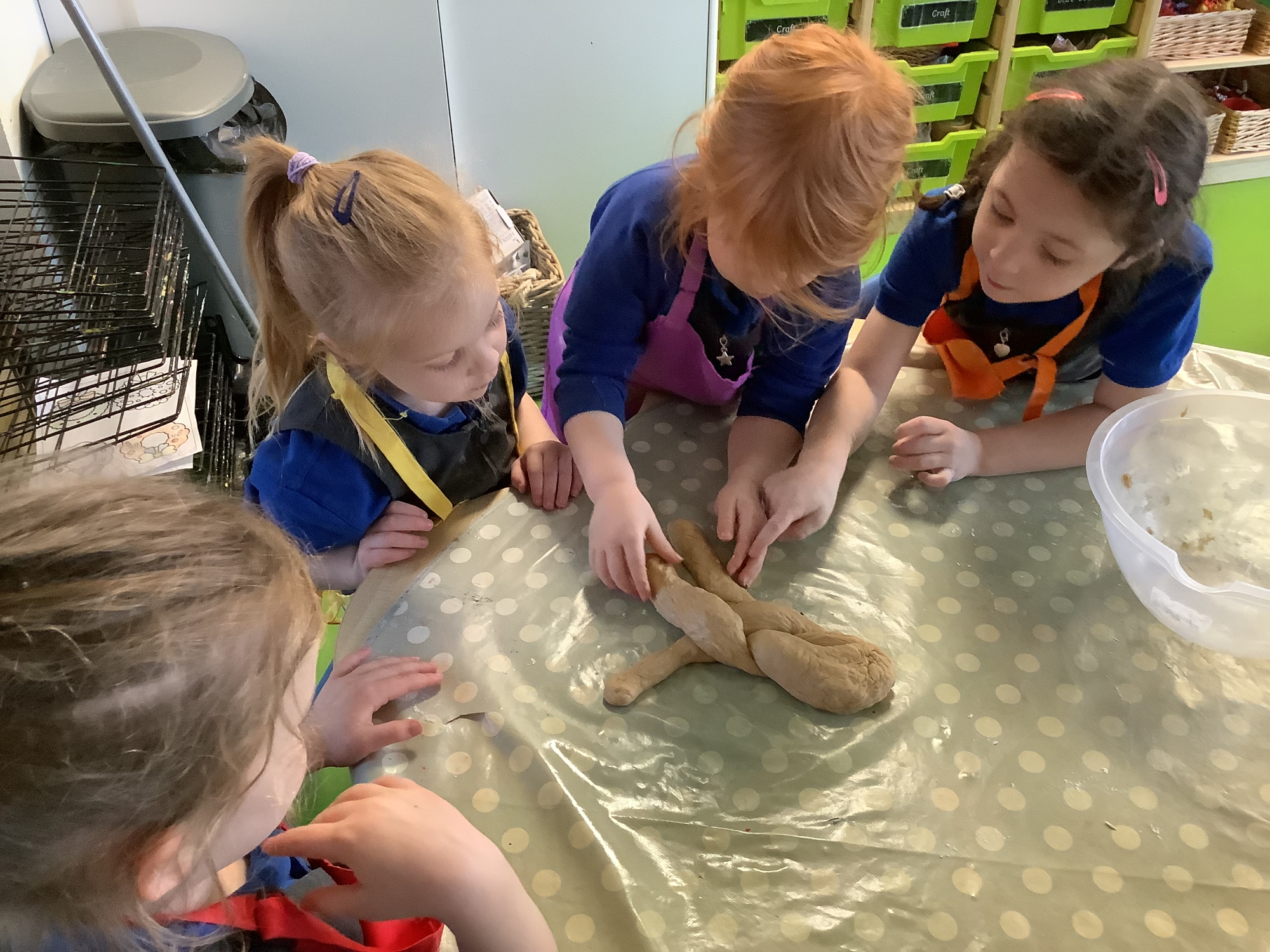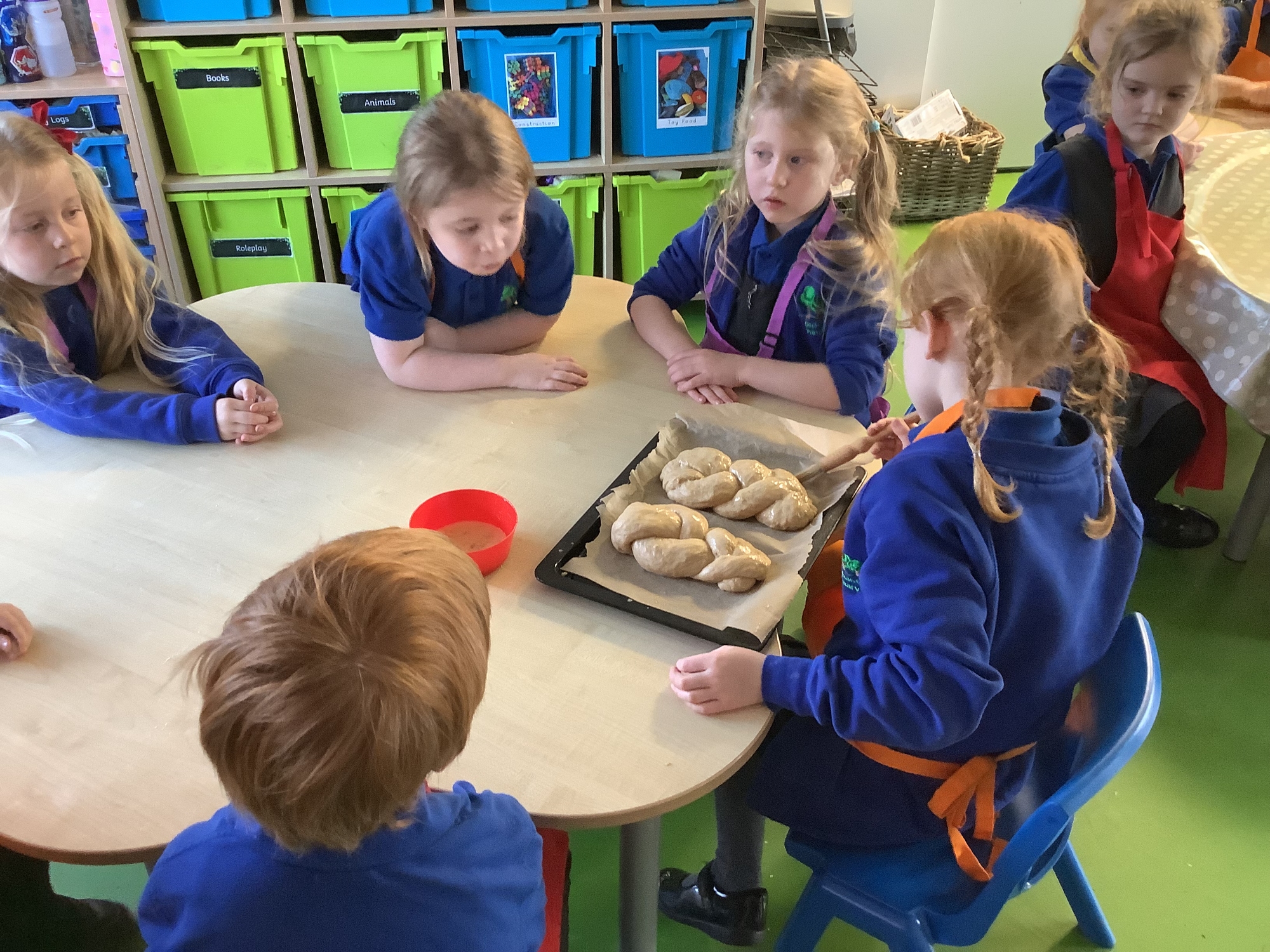 We learnt that some people celebrate Hannukah. We made Challah bread - we mixed the ingredients into a dough, then we kneaded it. We let it prove and then plaited it and baked it in the oven. It was delicious! We also learnt about the 8 candles of Hannukah. We made a menorah using a paper plate and added 8 paper candles.