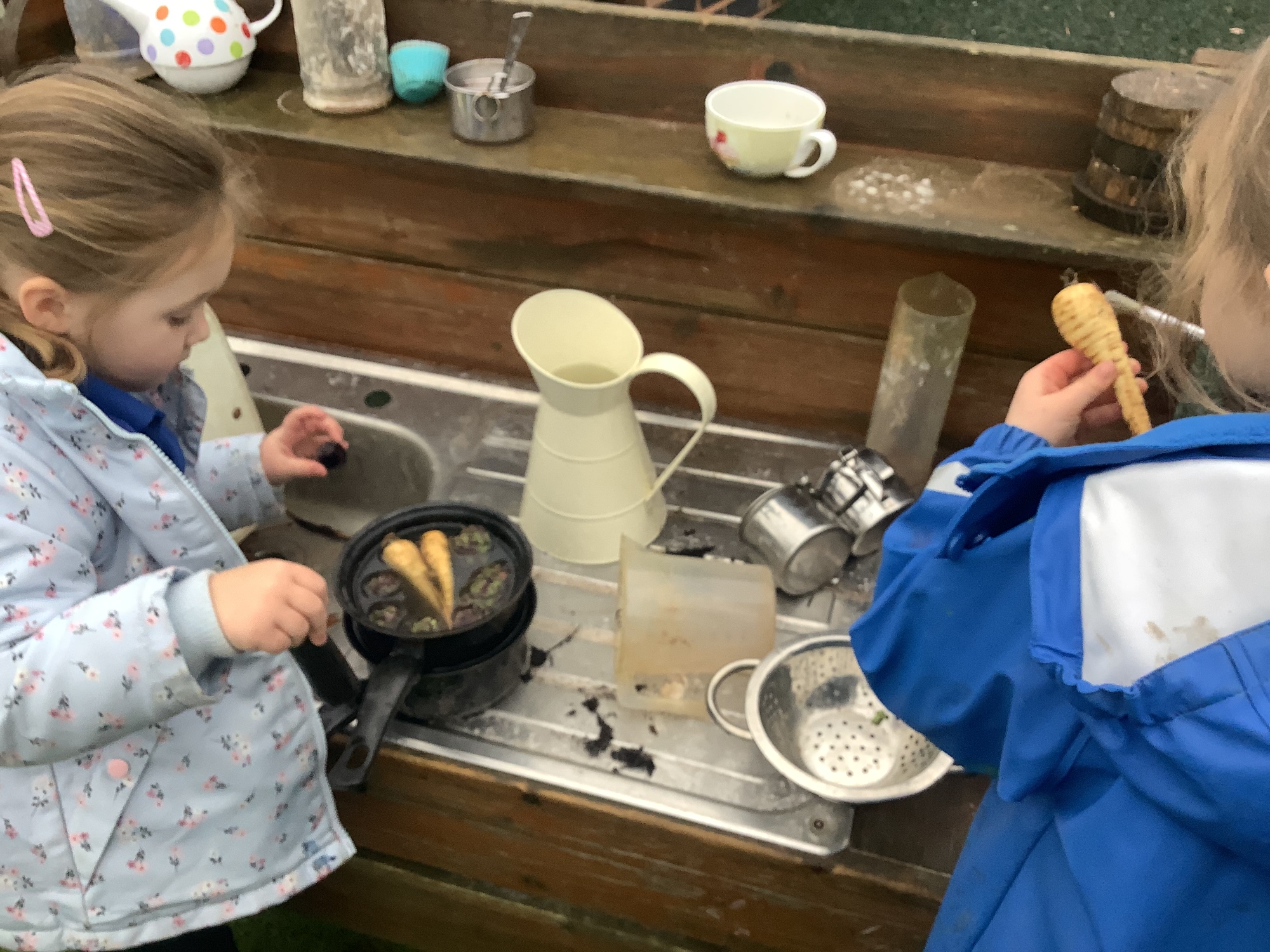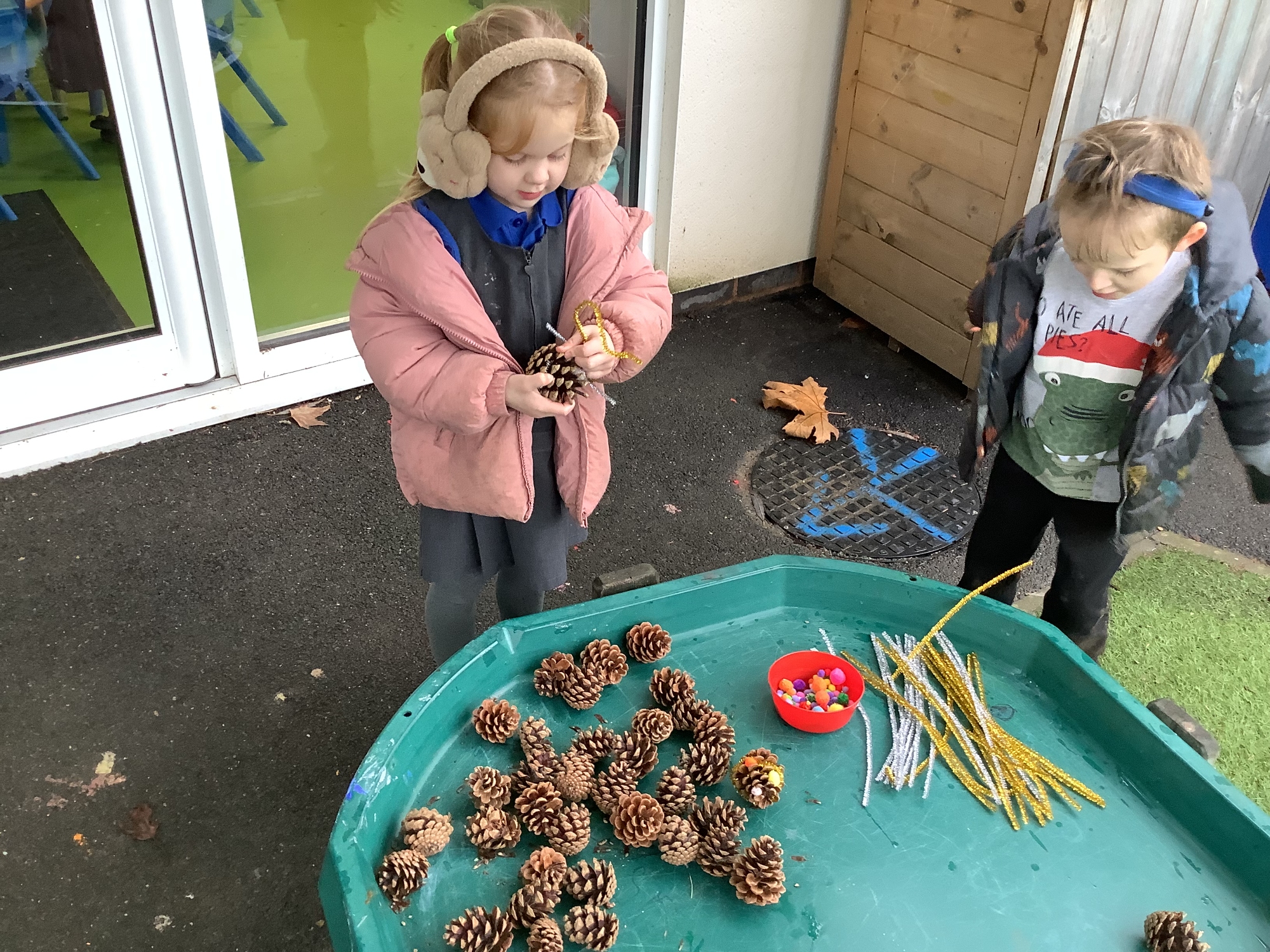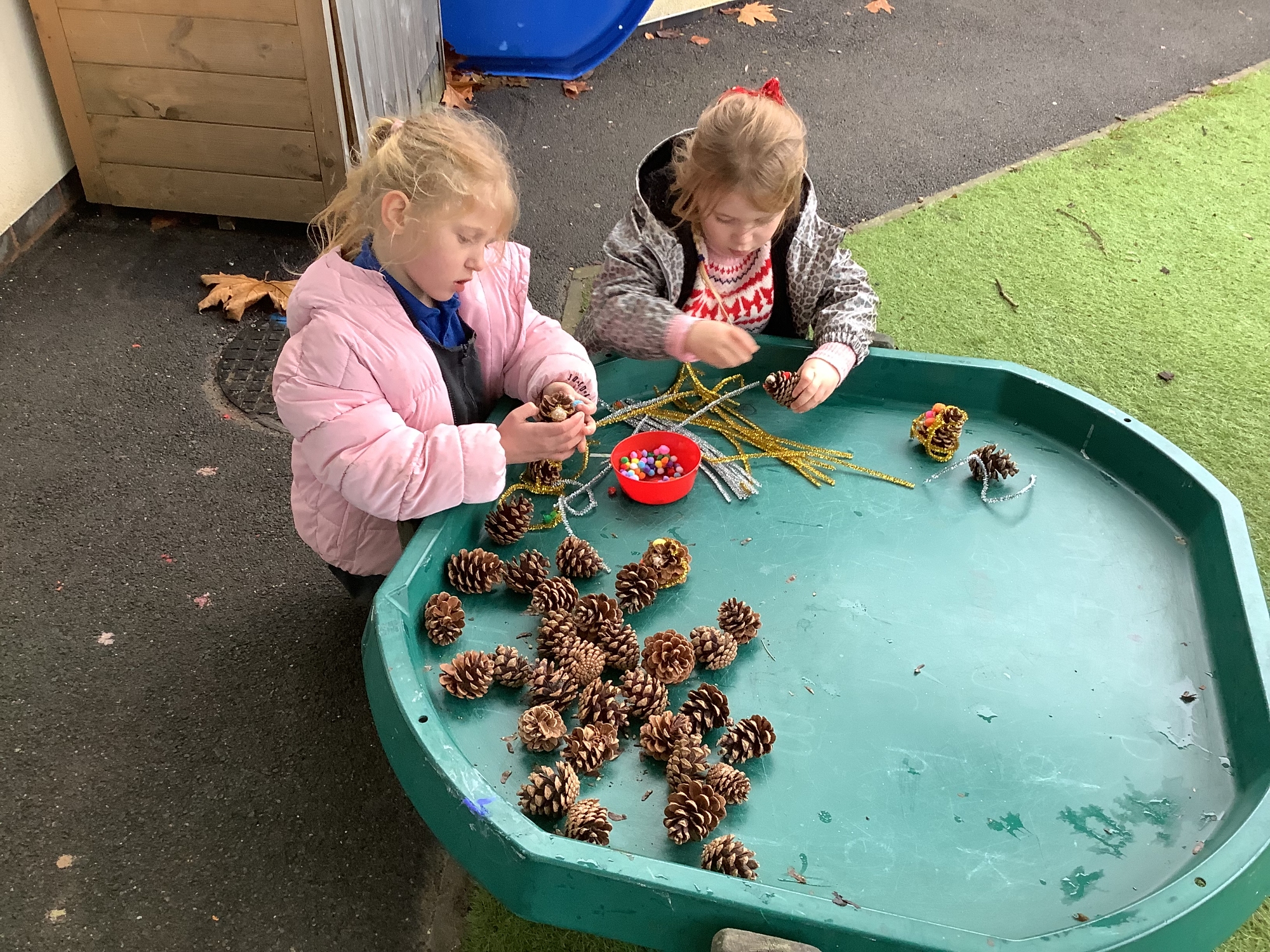 We also celebrated Christmas! We made Christmas trees out of pine cones and decorated with pom pom baubles and pipecleaner tinsel. We also served up Christmas dinner in the mud kitchen - carrots, parsnips, sprouts and muddy gravy!