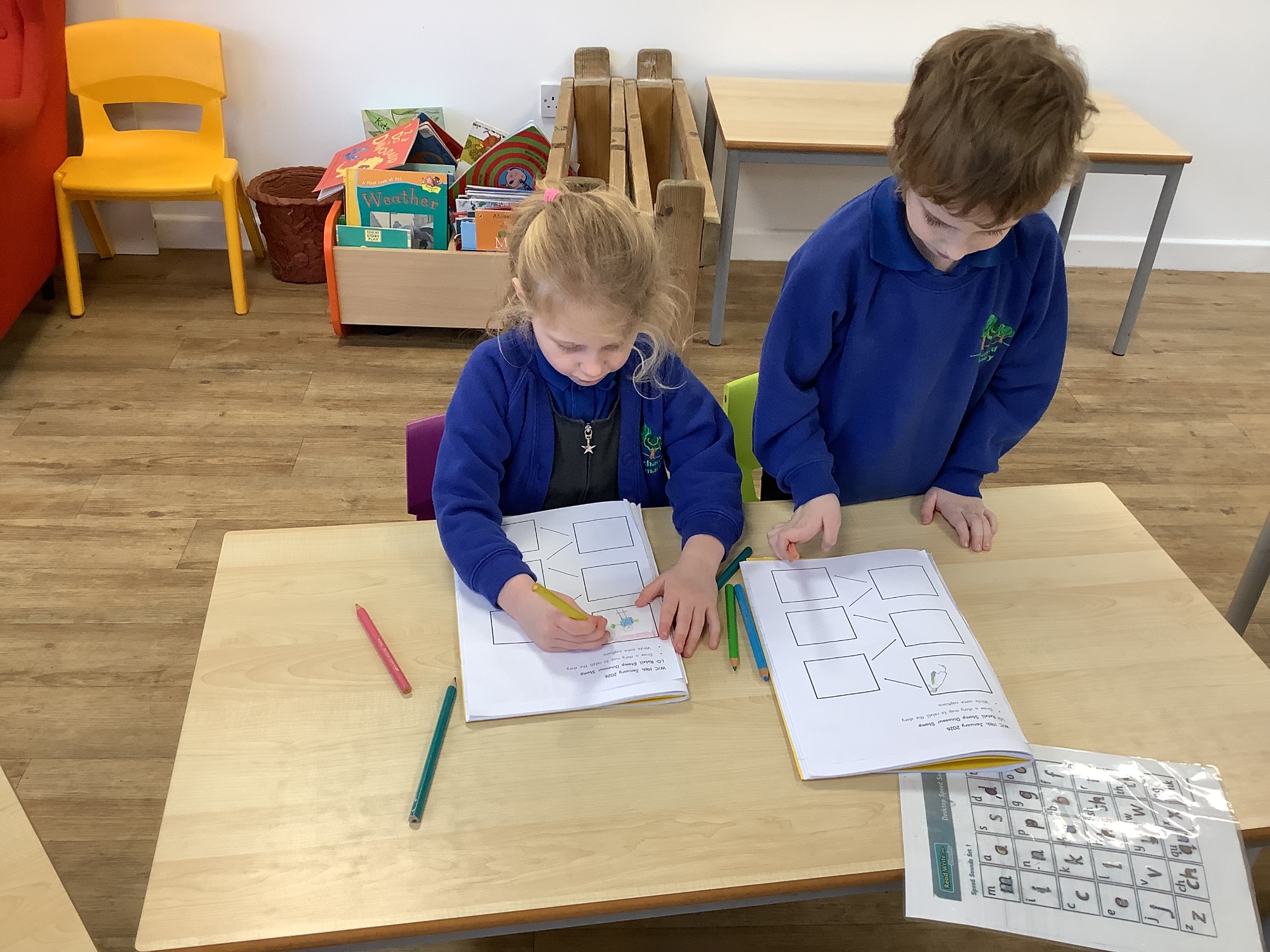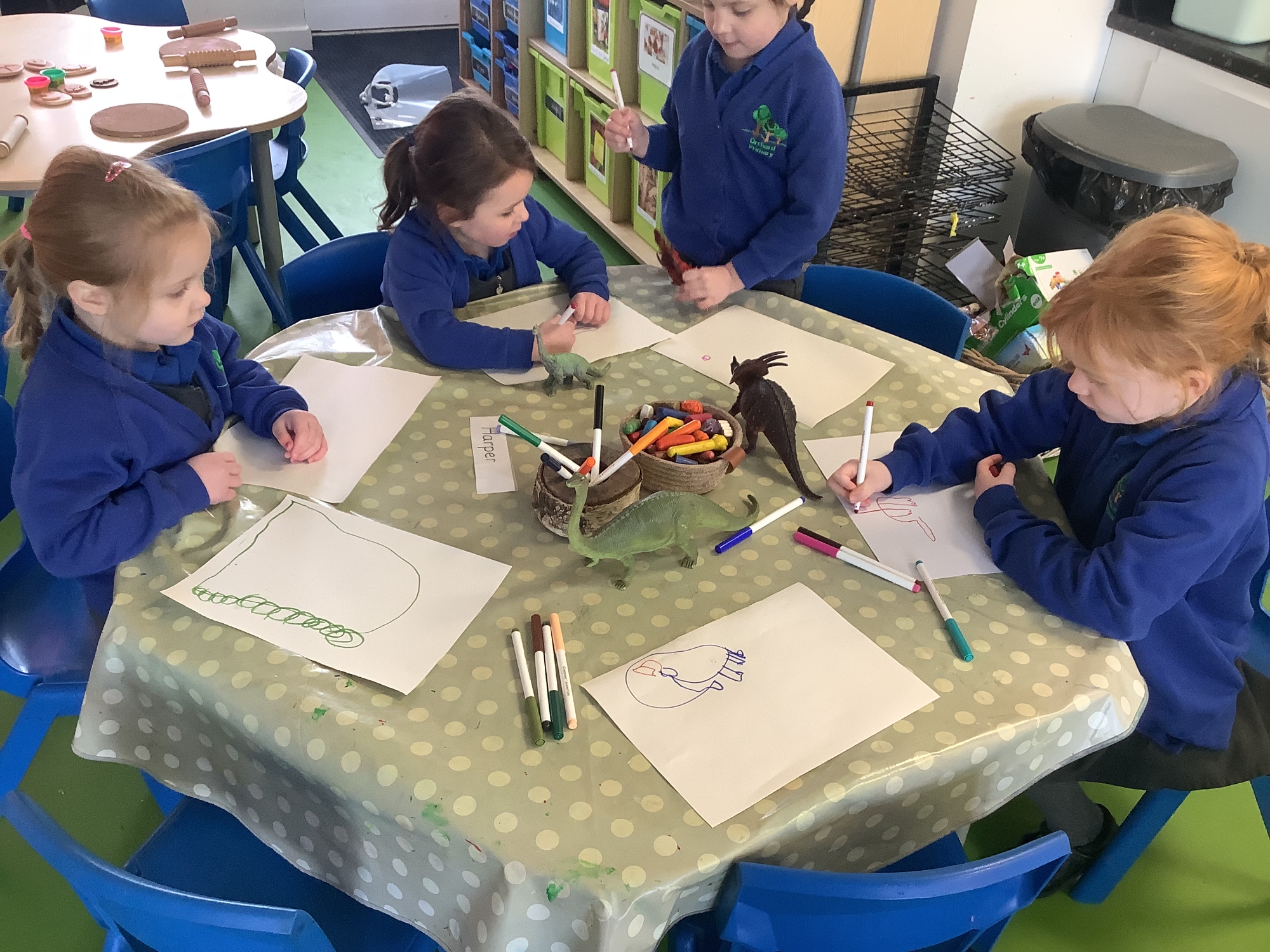 In Literacy, we have been drawing our own dinosaur land. We then wrote about the features of our dinosaur land, such as 'I can see a volcano.'