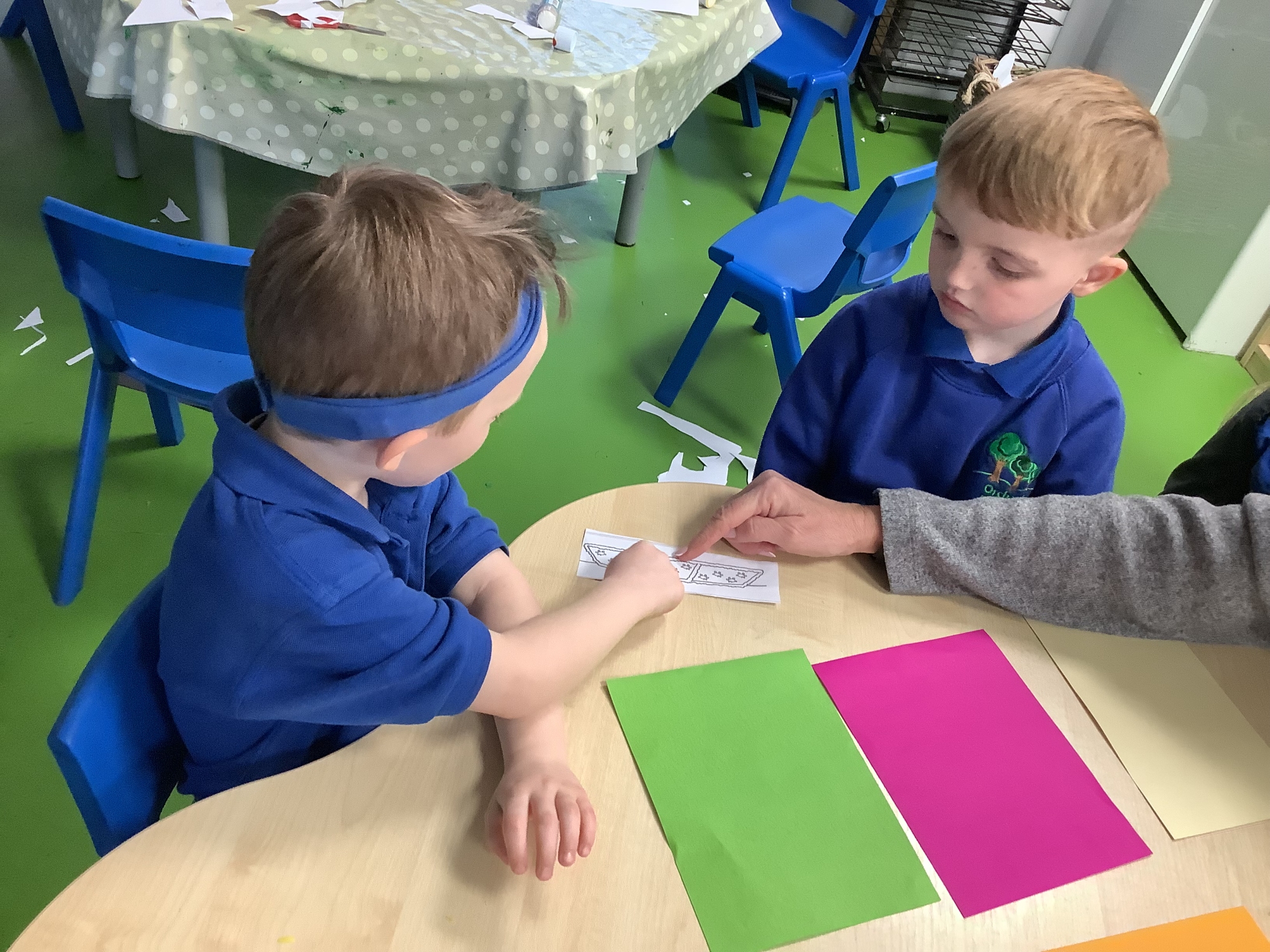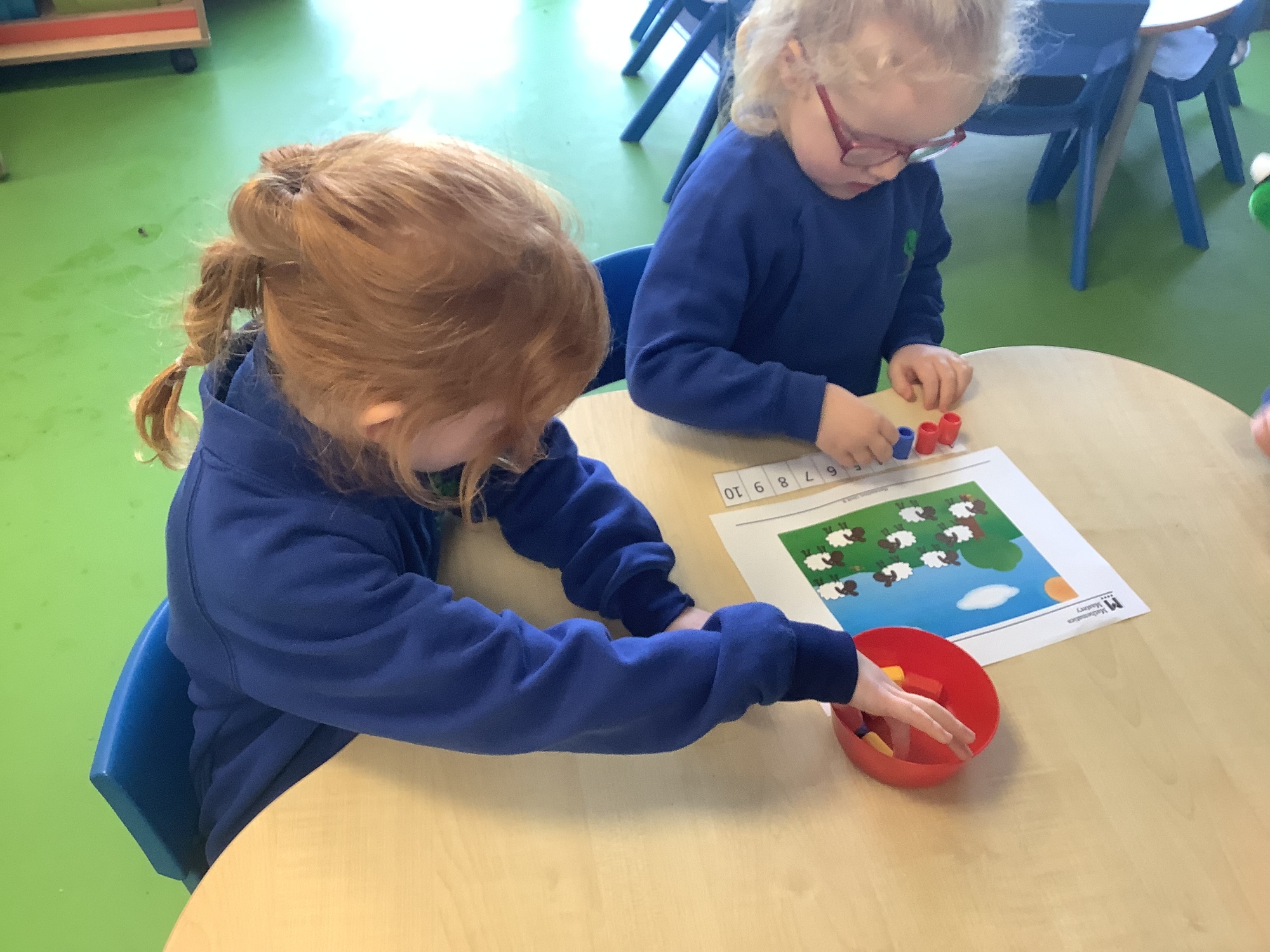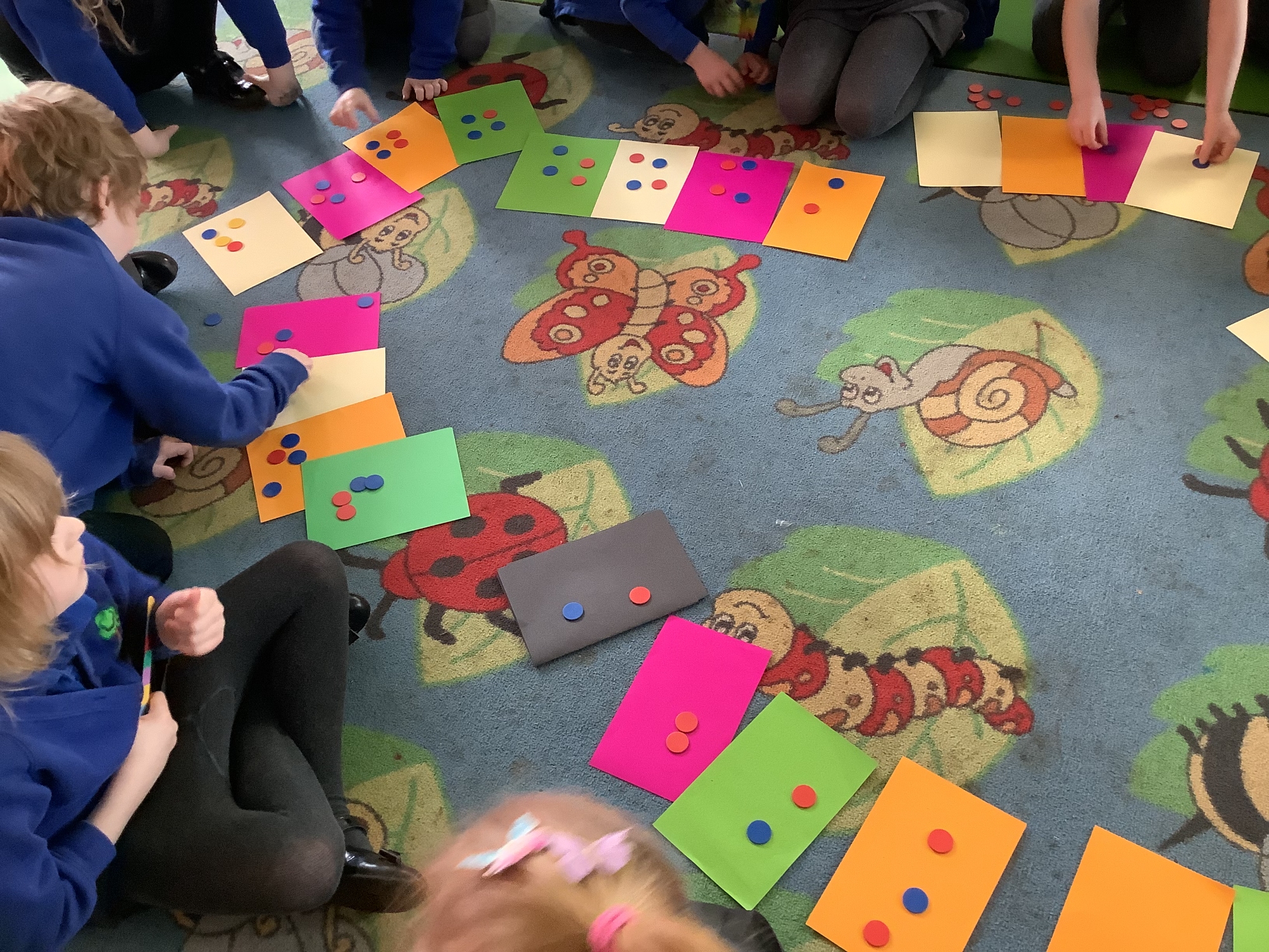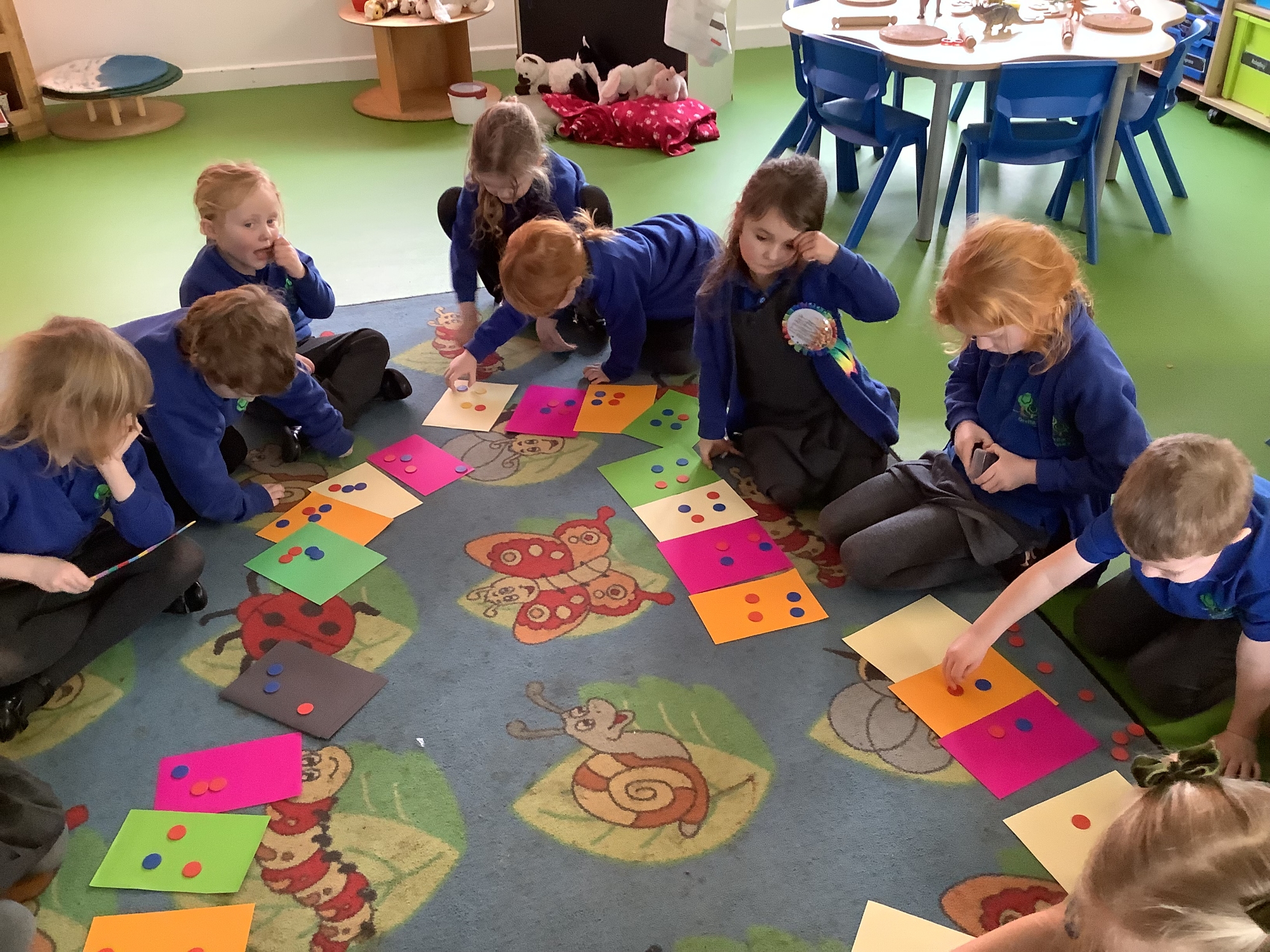 In Maths this week, we have been learning about sharing equally. At Old MacDonald's farm, we had to share the sheep equally between the fields. We used coloured paper to represent the fields and counters to represent the sheep. We worked out how many sheep are in each field.