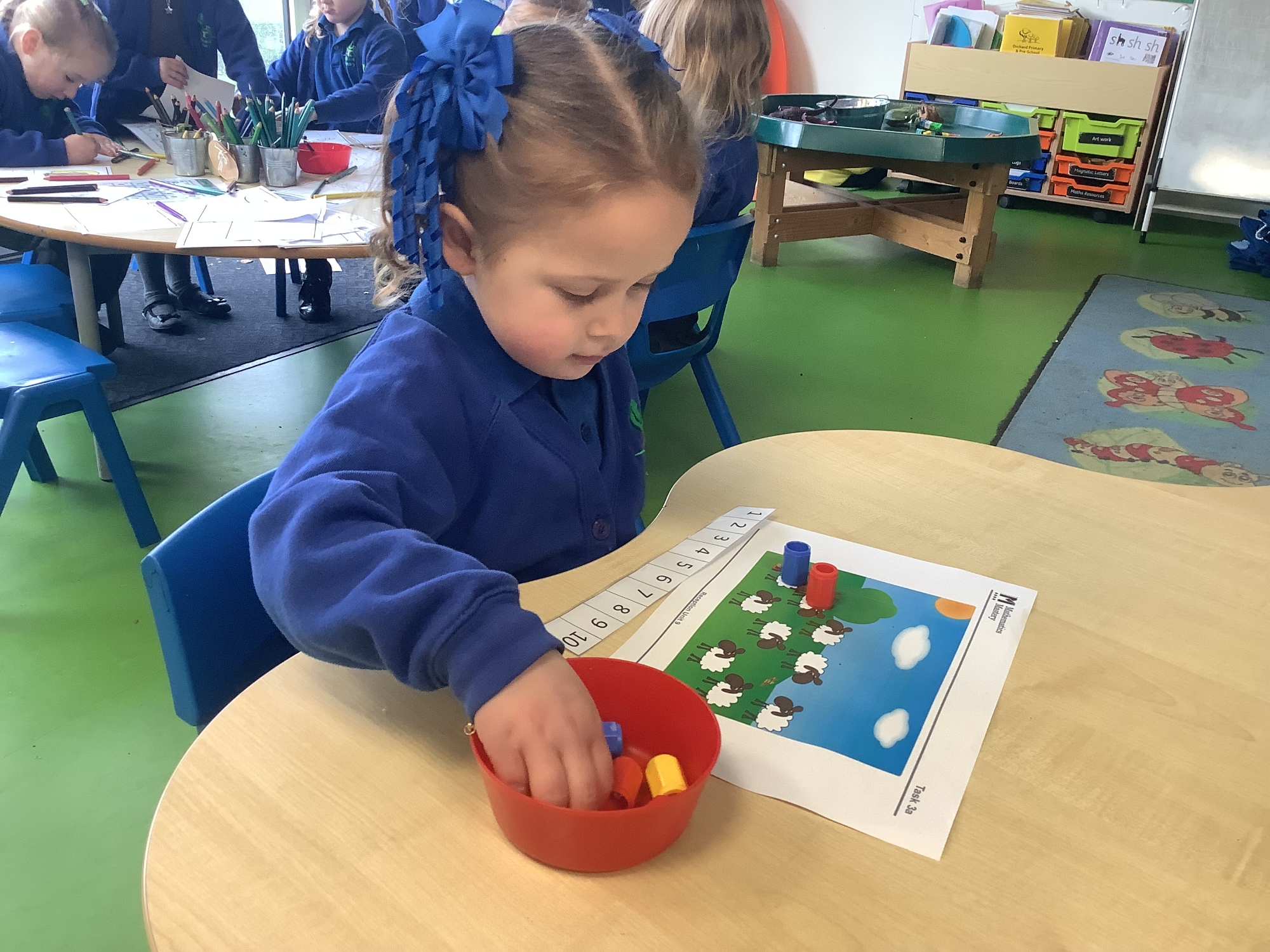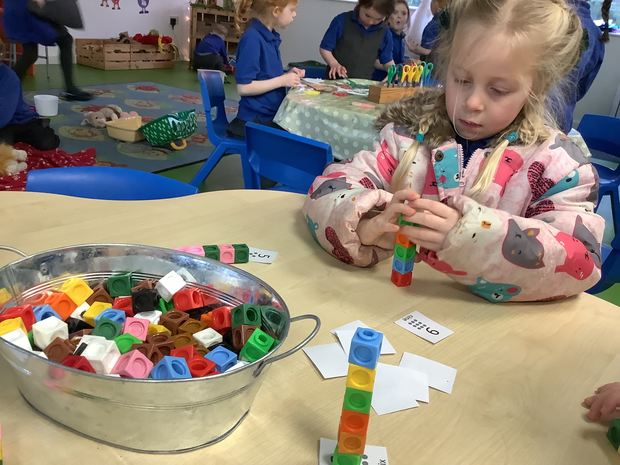 In Maths this week, we have been using a part-part-whole model to solve basic addition problems. We used blocks on the part-part-whole model, counting how many blocks we have altogether.
