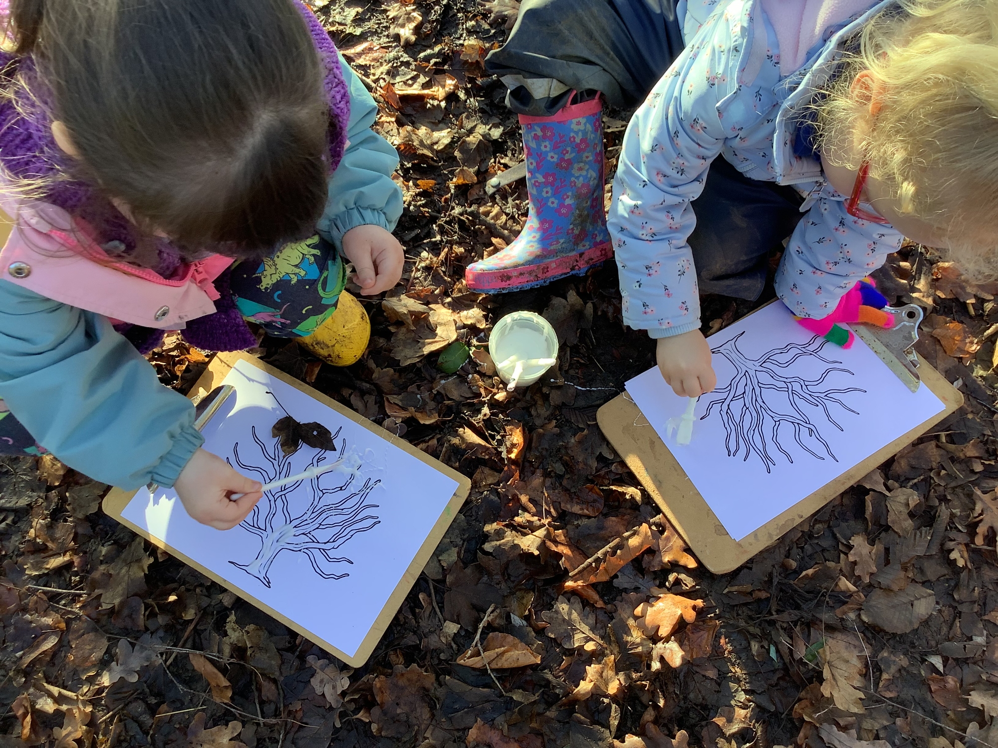 In Woodland Explorers, we found out about evergreen and deciduous trees and made winter tree pictures using nature items.