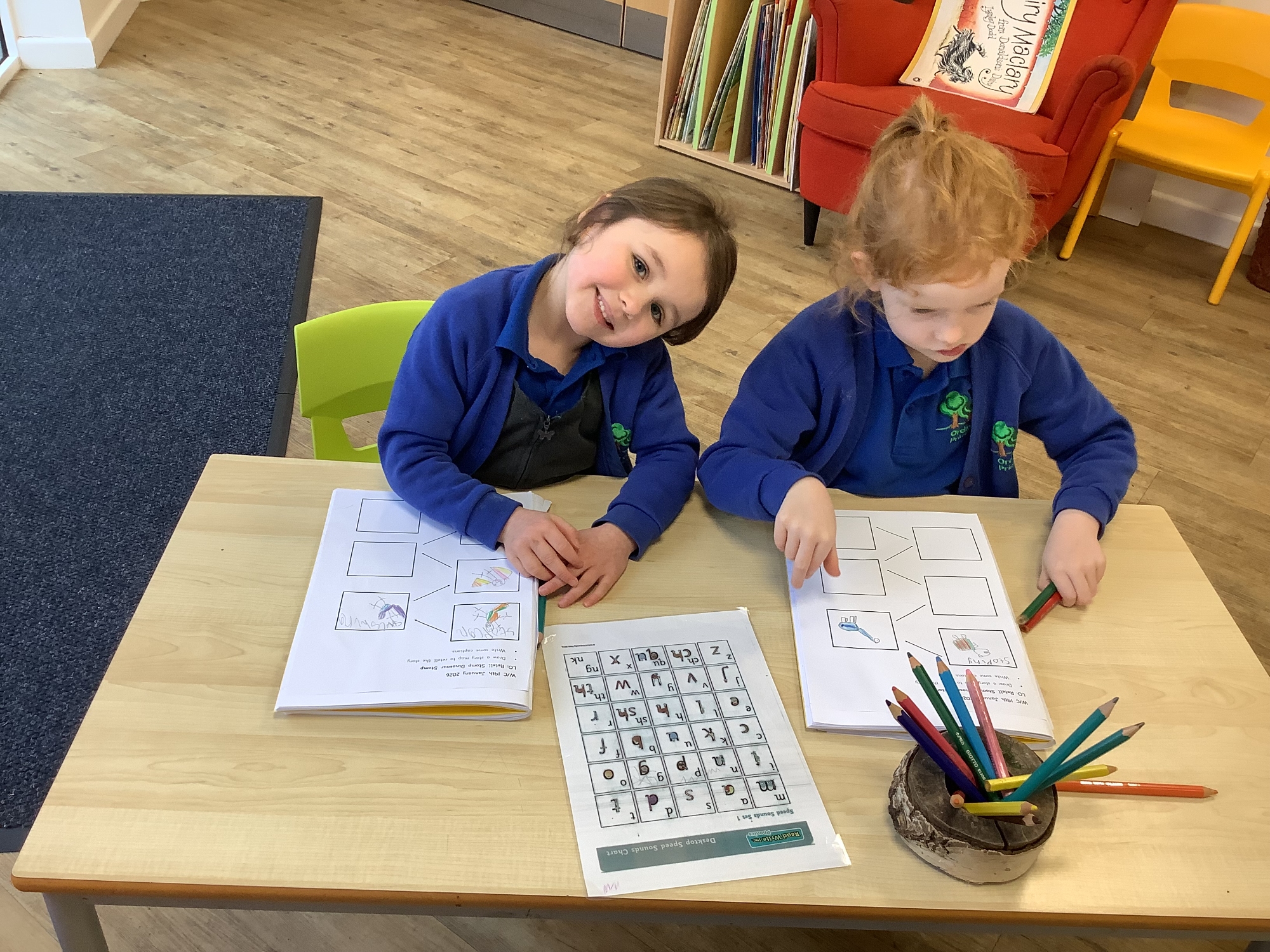 In Literacy, we finished our class story map for 'Room on the Broom'. We then drew our own story map and wrote some words on it. We have also been practising writing simple three-letter words on the writing table.