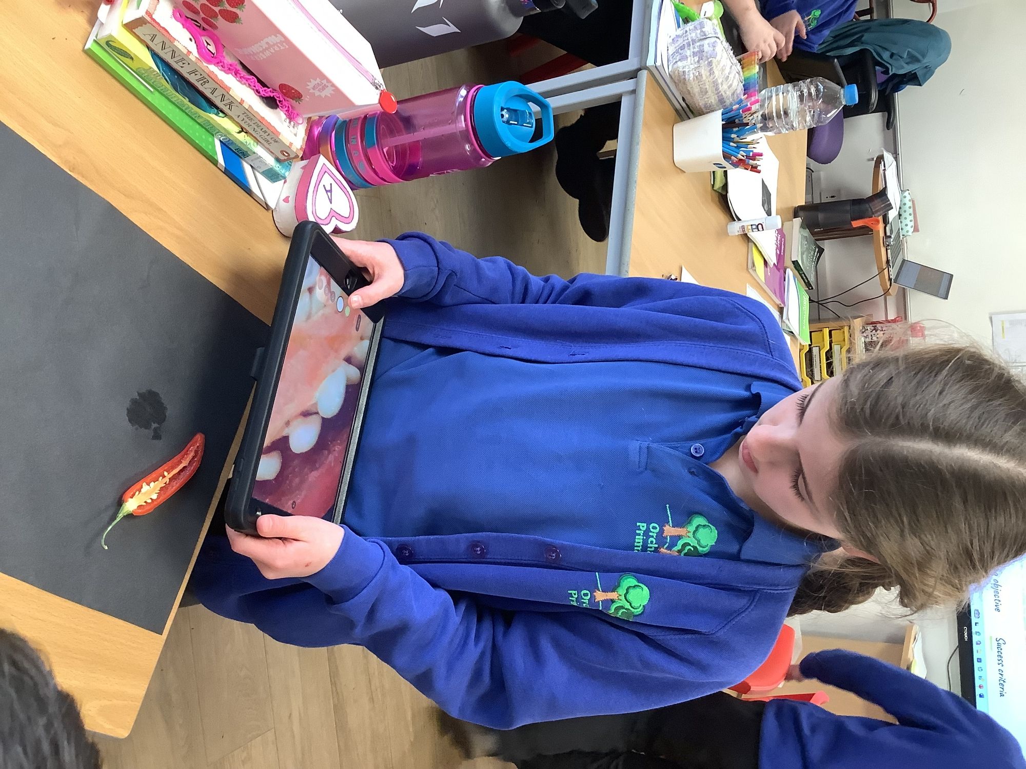 In Art, we used iPads to experiment with macrophotography. Firstly, of fruits and vegetables, which we edited to create a black and white image, and then using photographs of instruments, we created an album cover.