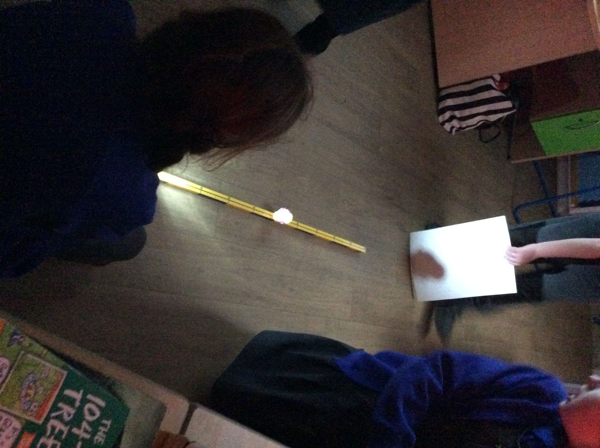 Week 4. Today in Science, we conducted an experiment to see how the shadow changes the further from the light source. We had to work in a darkened room so the pictures may be a bit dark. We had to keep the object constant, the angle of the torch and the distance from the light source was varied and the height of the shadow marked onto a piece of white paper. We concluded the further the object is from the light source the smaller the shadow.