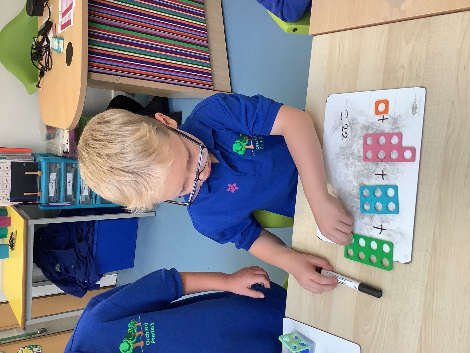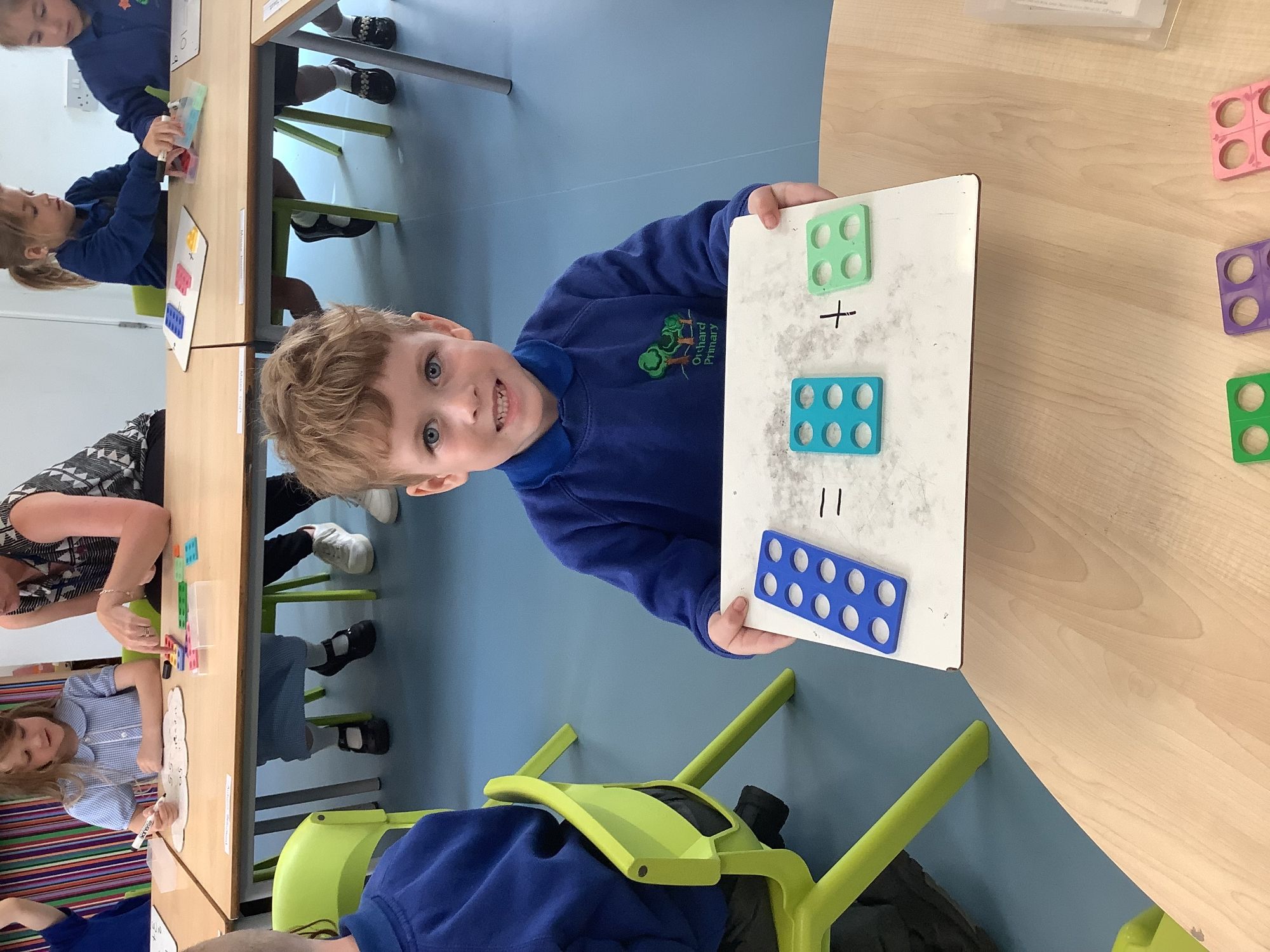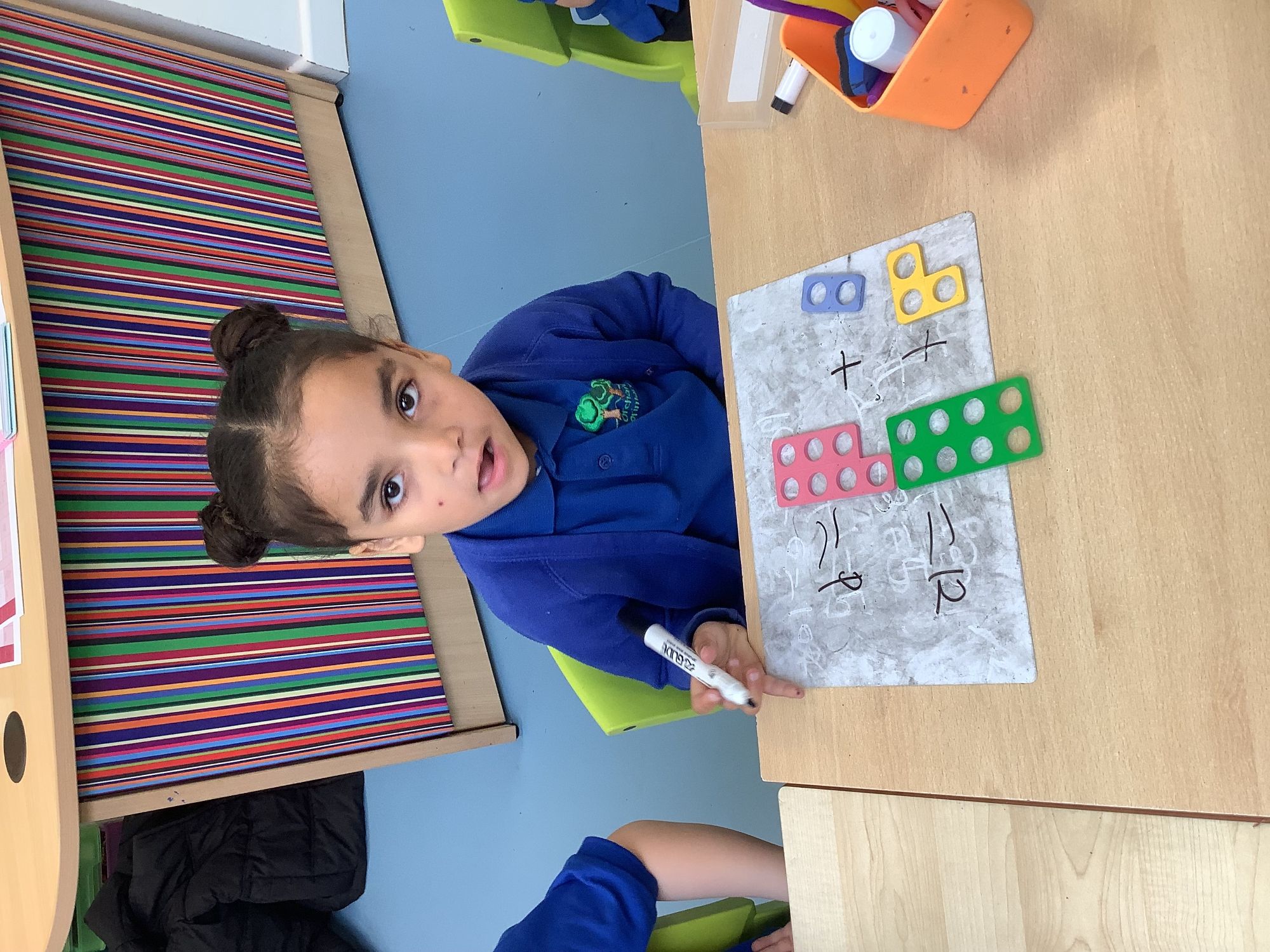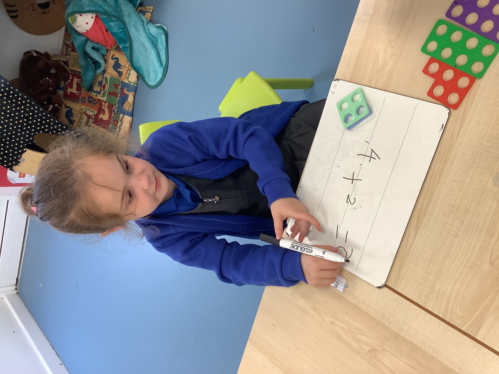 In Maths this week we have started to look at vertical addition. We had to make sure the numbers were placed in the correct box, and we used the correct sign to show whether we were adding or taking away. We will continue to build on this throughout the year.