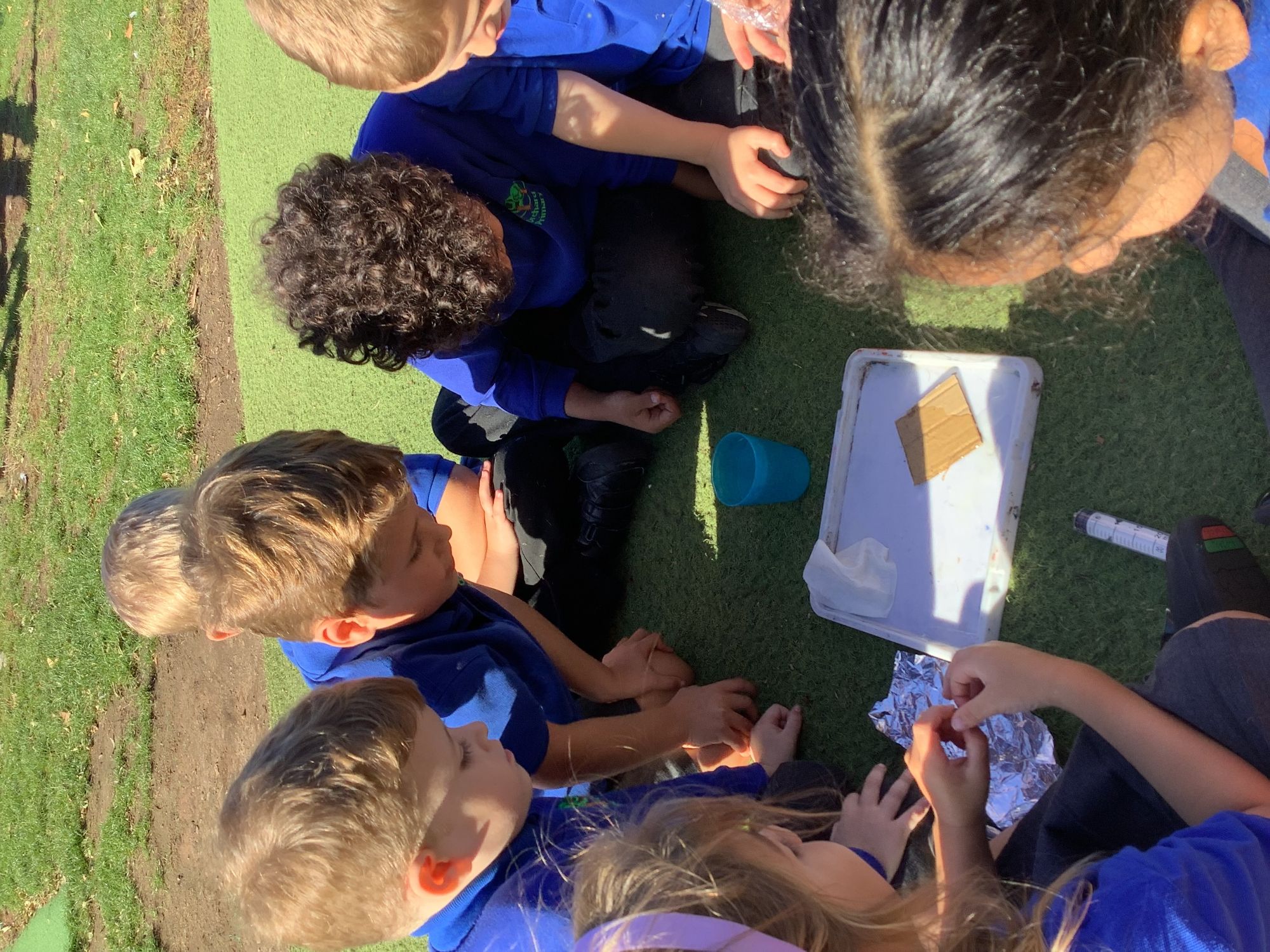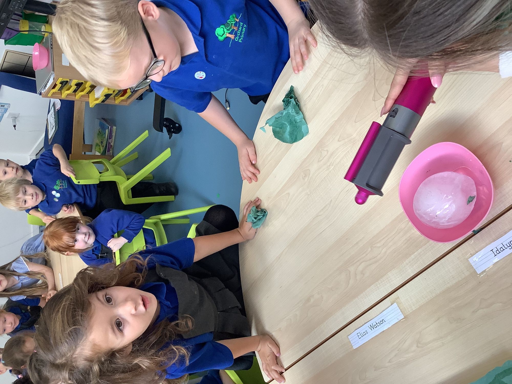 In Science, we have been looking at melting and freezing. We had blocks of ice and in small groups we had to work out the best way to melt them. After rubbing it with a towel and blowing on it, we found the best way was to use a hairdryer.