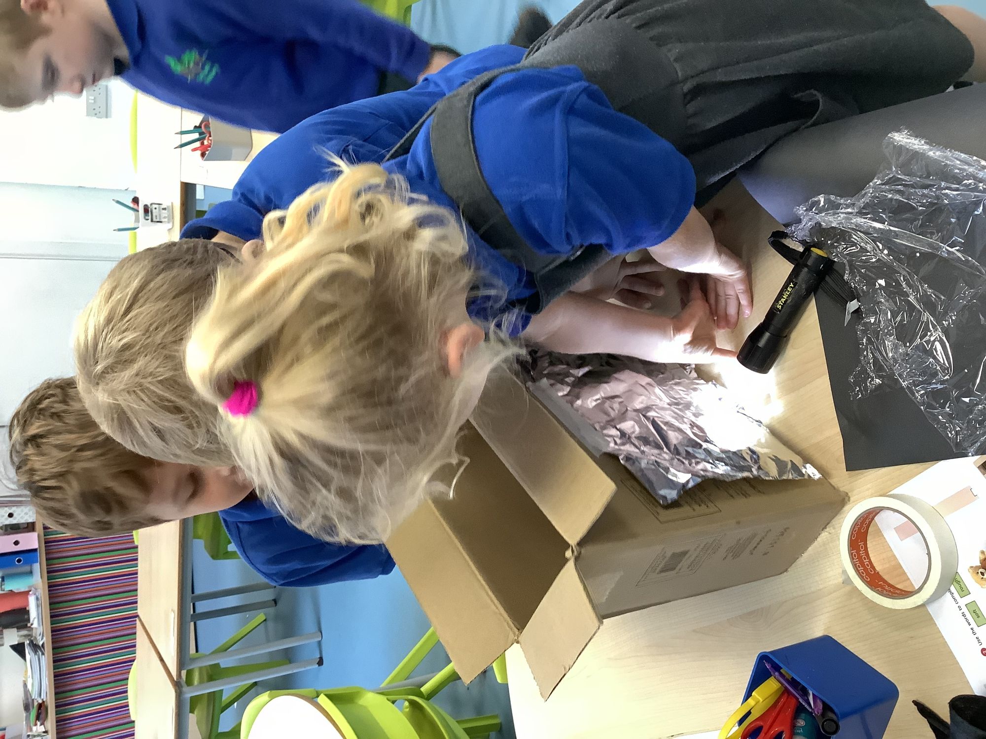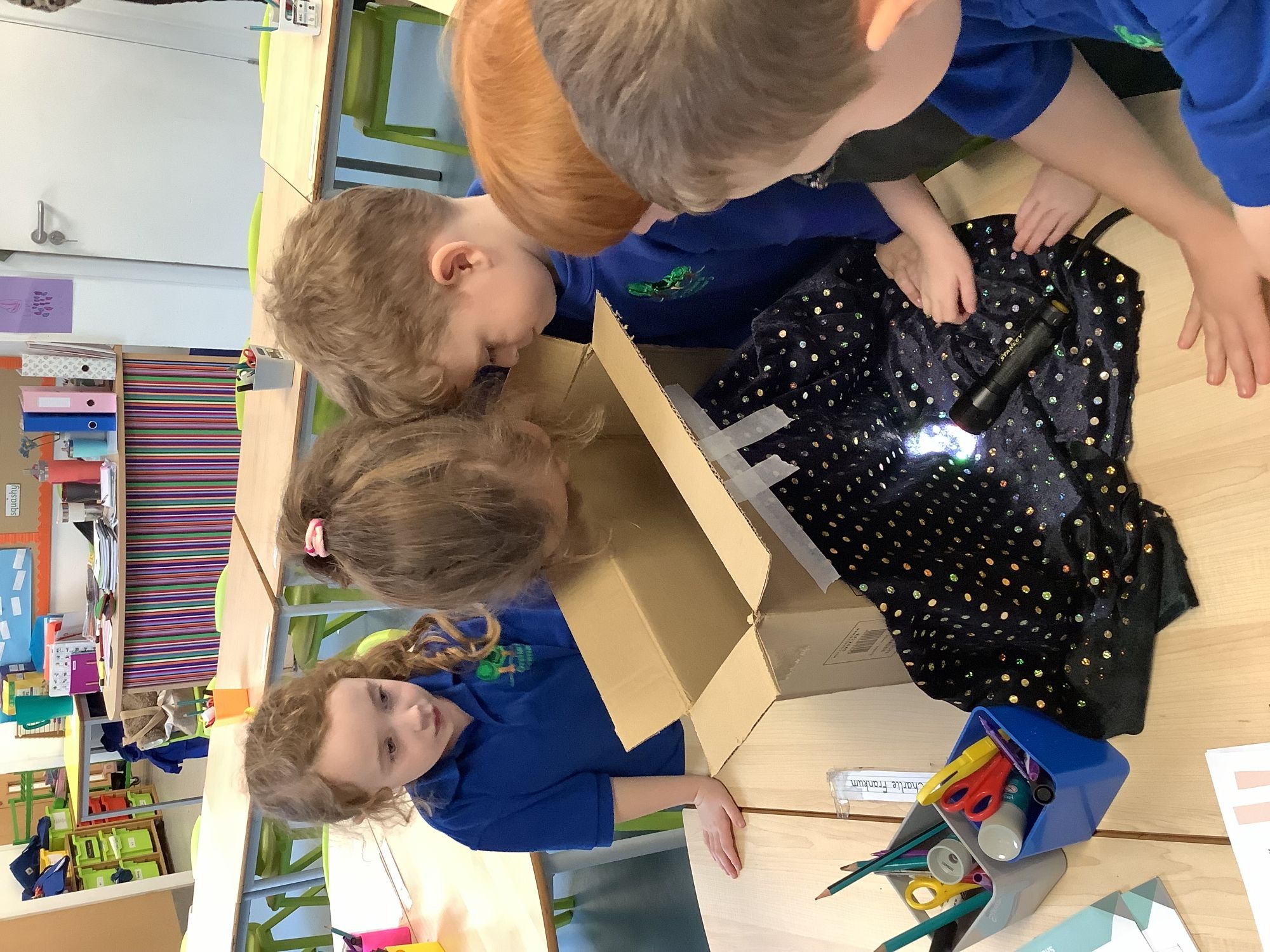 In Science, we have been investigating which materials would be best for making a curtain. We learned two new words — transparent and opaque — and tested different materials such as cling film, foil, black card, and black cotton. Using a box and a torch, we explored which material blocked out the most light. We decided that cling film wasn’t the best choice because it is transparent and too thin, but the black cotton was perfect as it was soft and opaque!